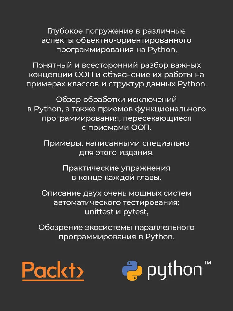 💳 Оплатить за товар можно при получении 🇰🇿 Есть бесплатная доставка по Казахстану от 1 дня 🎁 Копите бонусы с каждой покупки Серия: Библиотека программиста Глубоко погрузитесь в различные аспекты объектно-ориентированного программирования на Python, паттерны проектирования, приемы манипулирования данными и вопросы тестирования сложных объектно-ориентированных систем. Обсуждение всех понятий подкрепляется примерами, написанными специально для этого издания, и практическими упражнениями в конце каждой главы. Код всех примеров совместим с синтаксисом Python 3.9+ и дополнен аннотациями типов для упрощения изучения. |