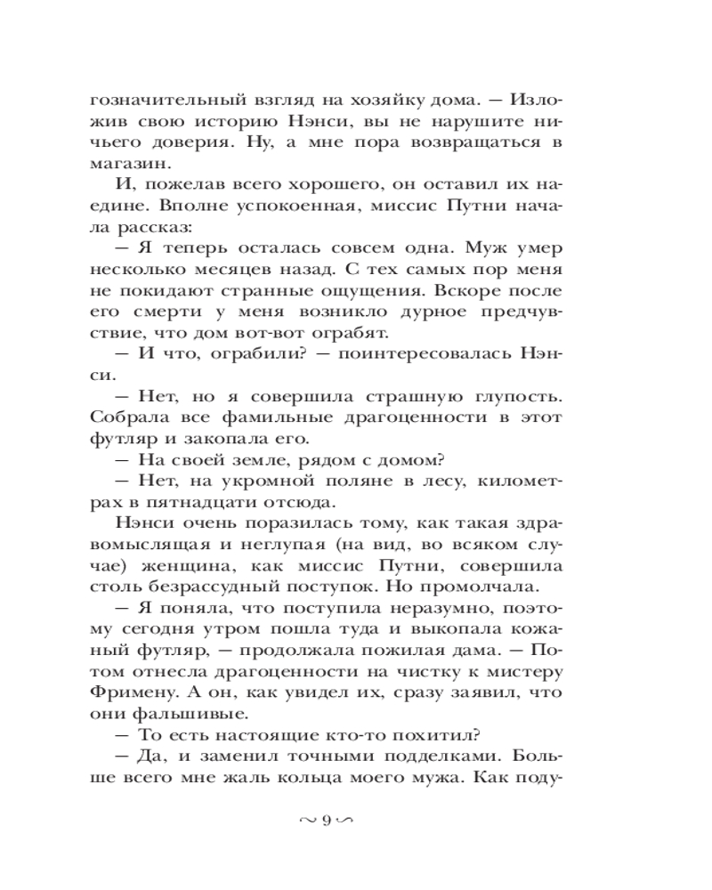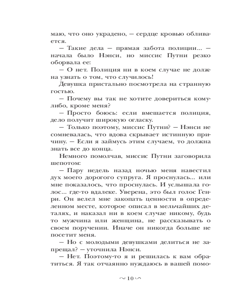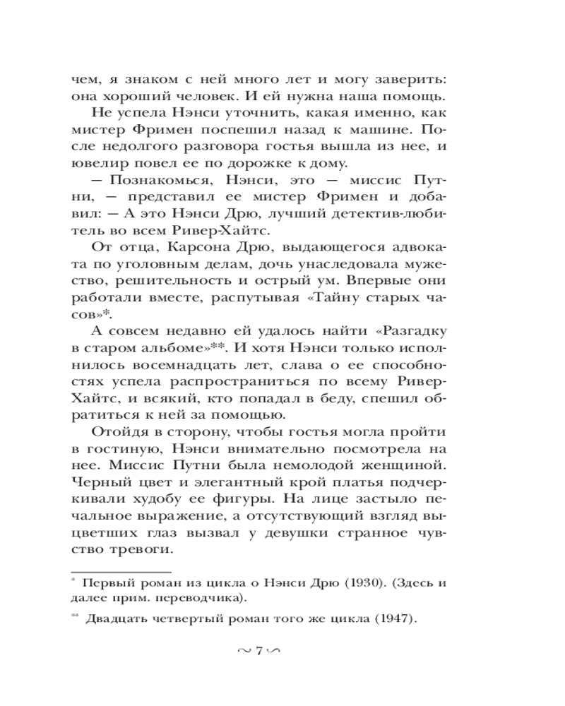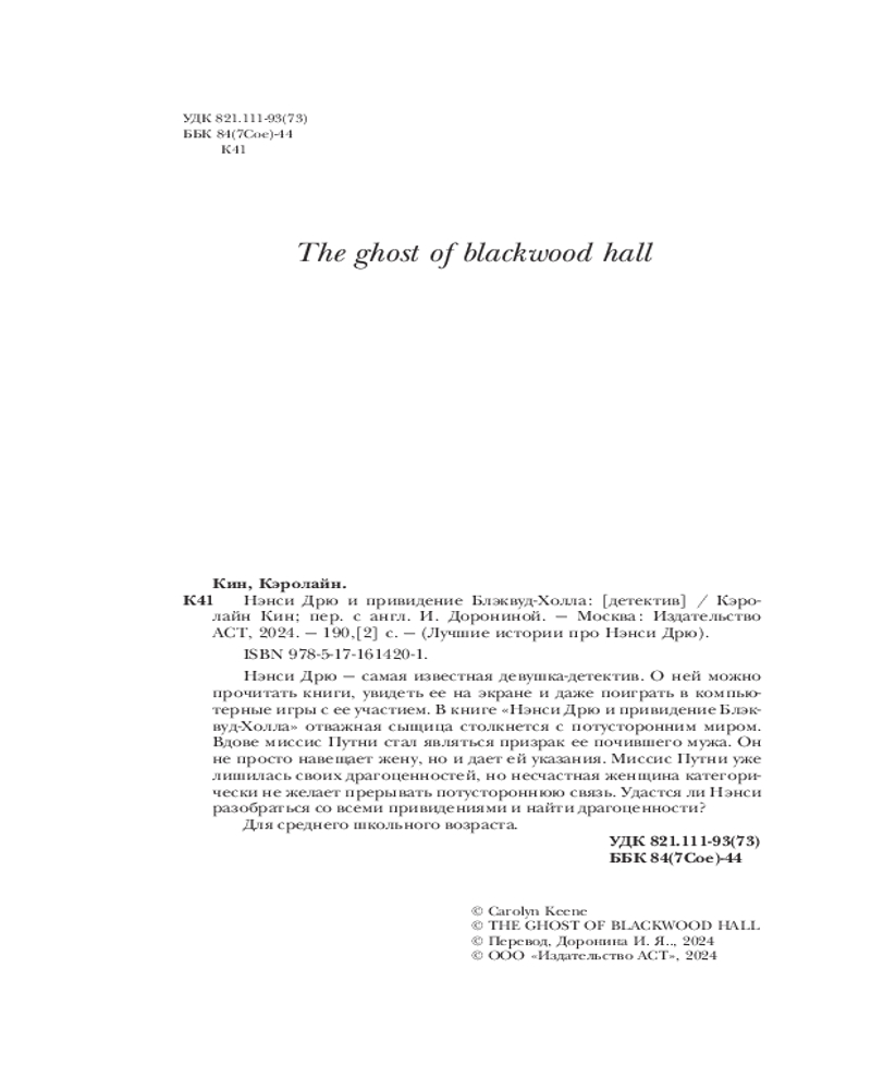 Нэнси Дрю и привидение Блэквуд-ХоллаВ данный момент этот товар отсутствует в продаже. Возможно, у нас найдется аналогичный или похожий товар здесь. Серия: Лучшие истории про Нэнси Дрю Нэнси Дрю — самая известная девушка-детектив. О ней можно прочитать книги, увидеть ее на экране и даже поиграть в компьютерные игры с ее участием. В книге «Нэнси Дрю и привидение Блэквуд-Холла» отважная сыщица столкнется с потусторонним миром. Вдове миссис Путни стал являться призрак ее почившего мужа. Он не просто навещает жену, но и дает ей указания. Миссис Путни уже лишилась своих драгоценностей, но несчастная женщина категорически не желает прерывать потустороннюю связь. Удастся ли Нэнси разобраться со всеми привидениями и найти драгоценности? |