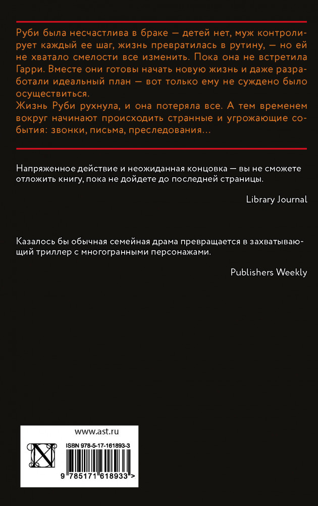 💳 Оплатить за товар можно при получении 🇰🇿 Есть бесплатная доставка по Казахстану от 1 дня 🎁 Копите бонусы с каждой покупки Серия: Психологический триллер (м) Руби была несчастлива в браке — детей нет, муж контролирует каждый ее шаг, жизнь превратилась в рутину, — но ей не хватало смелости все изменить. Пока она не встретила Гарри. Вместе они готовы начать новую жизнь и даже разработали идеальный план — вот только ему не суждено было осуществиться. Жизнь Руби рухнула, и она потеряла все. А тем временем вокруг начинают происходить странные и угрожающие события: звонки, письма, преследования... |