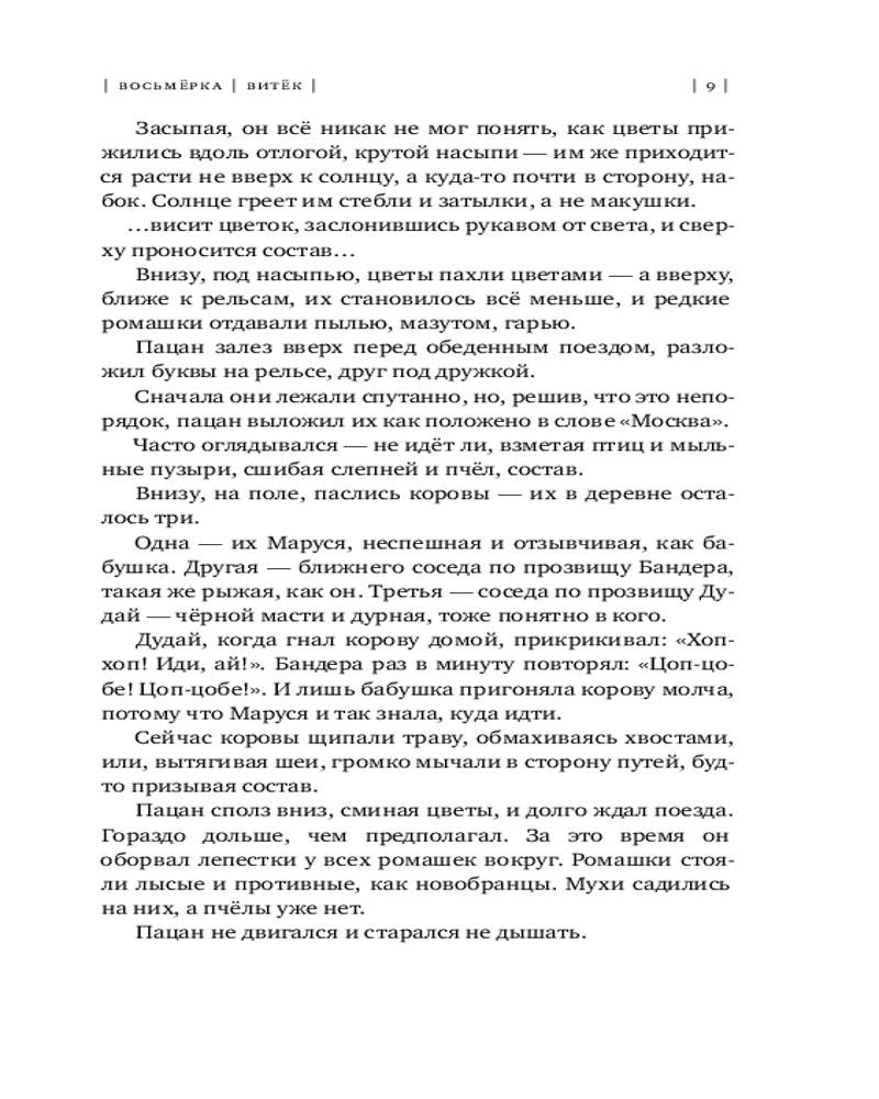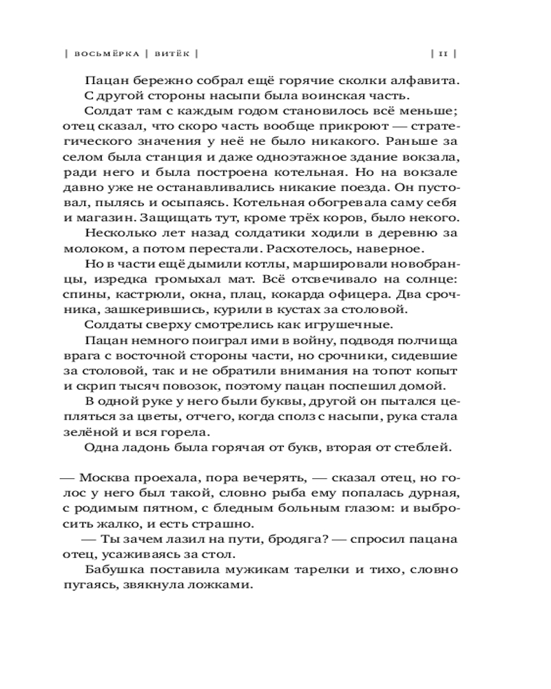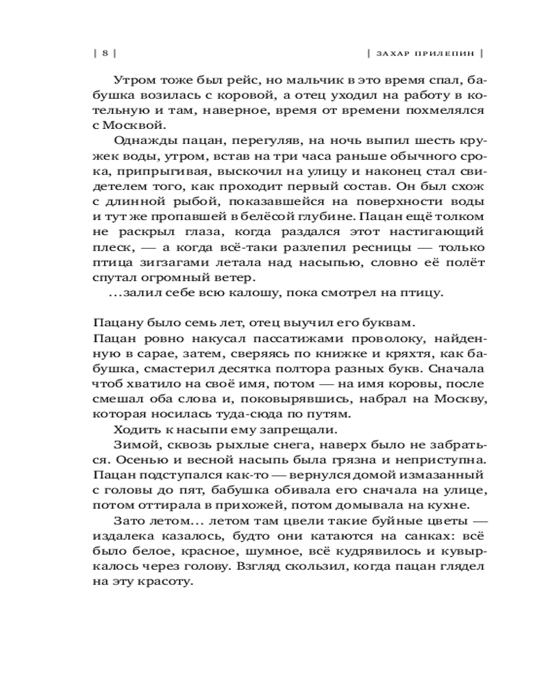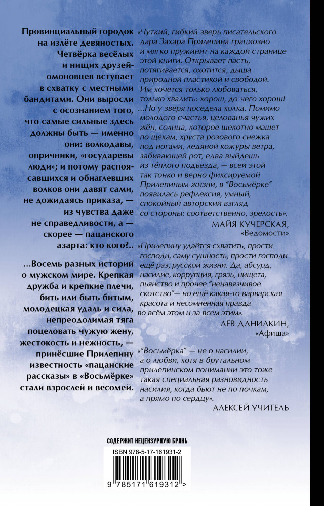 ...Восемь разных историй о мужском мире. Крепкая дружба и крепкие плечи, бить или быть битым, молодецкая удаль и сила, непреодолимая тяга поцеловать чужую жену, жестокость и нежность, — принёсшие Прилепину известность «пацанские рассказы» в «Восьмёрке» стали взрослей и весомей. |