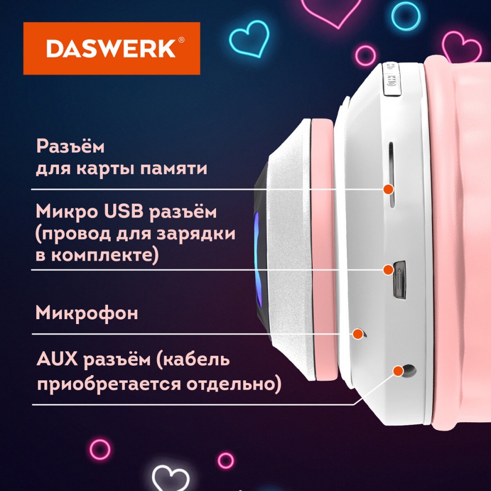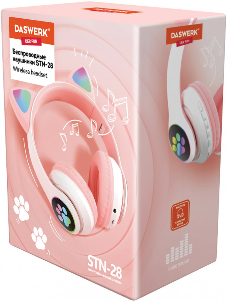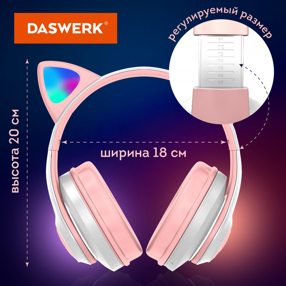 качество звук комфорт надежность В данный момент этот товар отсутствует в продаже. Возможно, у нас найдется аналогичный или похожий товар здесь. Беспроводные наушники DASWERK с кошачьими ушками и подсветкой — это яркая и надёжная гарнитура. Слушай музыку, аудиокниги, играй! Беспроводные наушники стилизованы кошачьими ушками и лапками. Также наушники имеют светодиодную подсветку внутри, которая ярко переливается, создает праздничное настроение и является привлекательным отличием от других моделей. Подсветку можно отключить и продолжить пользоваться наушниками. Беспроводные наушники с ушками DASWERK изготовлены из прочного и легкого abs-пластика. Подойдут как для девочки, так и для мальчика. Наушники имеют регулируемое по длине оголовье и снабжены шкалой с делениями, что позволяет отрегулировать оголовье под необходимый размер. Дужка оголовья имеет силиконовую накладку для комфортного прилегания к голове.