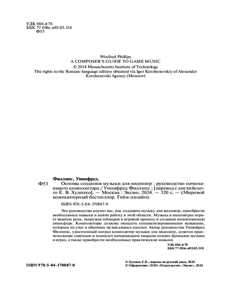 Серия: Мировой компьютерный бестселлер. Гейм-дизайн Перед вами практическое руководство по созданию неповторимой музыки для видеоигр! Музыка в видеоиграх представляет собой сложную композицию, которая погружает человека в игру, задает темп и способствует интерактивности. Создатели музыки для видеоигр должны овладеть множеством специализированных навыков, которым не обучают в консерватории. Автор этого руководства Уинифред Филлипс — удостоенный наград композитор для видеоигр. Она поможет начинающим творцам приобрести необходимые практические навыки, понять функцию музыки в играх и даже найти работу в этой области. Книга подойдет всем композиторам, которые хотят реализовать свой творческий потенциал в динамичной и растущей индустрии, проявить свою музыкальную индивидуальность и создать великолепную музыку в рамках ограничений новой среды. |