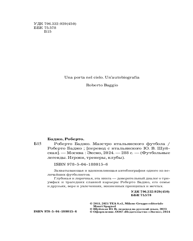 💳 Оплатить за товар можно при получении 🇰🇿 Есть бесплатная доставка по Казахстану от 1 дня 🎁 Копите бонусы с каждой покупки Серия: Футбольные легенды. Игроки, тренеры, клубы Проникновенная и вдохновляющая автобиография Божественного Хвостика, одного из величайших футболистов в истории. Глубокая и лиричная, эта книга — доверительный диалог о триумфах и трагедиях славной карьеры Роберто Баджо, его семье и друзьях, вере и увлечениях, жизненных принципах и мечтах. |