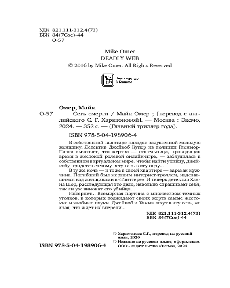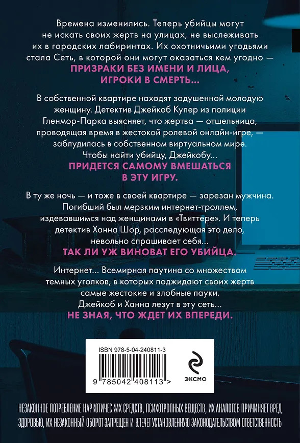 💳 Оплатить за товар можно при получении 🇰🇿 Есть бесплатная доставка по Казахстану от 1 дня 🎁 Копите бонусы с каждой покупки Серия: Главный триллер года (обложка) Времена изменились. Теперь убийцы могут не искать своих жертв на улицах, не выслеживать их в городских лабиринтах. Их охотничьими угодьями стала Сеть, в которой они могут оказаться кем угодно. Призраки без имени и лица, игроки в смерть... В собственной квартире находят задушенной молодую женщину. Детектив Джейкоб Купер из полиции Гленмор-Парка выясняет, что жертва, отшельница, проводящая время в жестокой ролевой онлайн-игре, заблудилась в собственном виртуальном мире. Чтобы найти убийцу, Джейкобу придется самому вступить в эту игру... |
