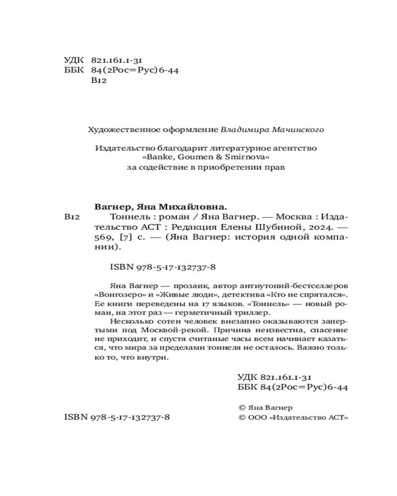 💳 Оплатить за товар можно при получении 🇰🇿 Есть бесплатная доставка по Казахстану от 1 дня 🎁 Копите бонусы с каждой покупки Серия: Яна Вагнер: история одной компании Яна Вагнер — прозаик, автор антиутопий-бестселлеров «Вонгозеро» и «Живые люди», детектива «Кто не спрятался». Ее книги переведены на 17 языков. «Тоннель» — новый роман, на этот раз — герметичный триллер. Несколько сотен человек внезапно оказываются запертыми под Москвой-рекой. Причина неизвестна, спасение не приходит, и спустя считаные часы всем начинает казаться, что мира за пределами тоннеля не осталось. Важно только то, что внутри. |