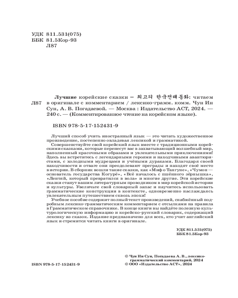 💳 Оплатить за товар можно при получении 🇰🇿 Есть бесплатная доставка по Казахстану от 1 дня 🎁 Копите бонусы с каждой покупки Серия: Комментированное чтение на корейском языке Лучший способ учить иностранный язык — это читать художественное произведение, постепенно овладевая лексикой и грамматикой. Совершенствуйте свой корейский язык вместе с традиционными корейскими сказками, которые перенесут вас в захватывающий волшебный мир, наполненный красочными образами и увлекательными приключениями! Здесь вы встретитесь с легендарными героями и находчивыми авантюристами, с холодными мудрецами и учёными дураками. Благодаря своей находчивости и отваге они преодолевают преграды и находят своё место в истории. В сборник вошли такие сказки, как «Миф о Тангуне», «Чумон — основатель государства Когурё», «Всё началось с пшённого зёрнышка», «Лентяй, который превратился в вола» и многие другие. Эти корейские сказки станут вашим литературным проводником в мир корейской истории и культуры. Увеличьте свой словарный запас и научитесь использовать грамматические конструкции в контексте, одновременно наслаждаясь увлекательным путешествием сквозь эпохи! |