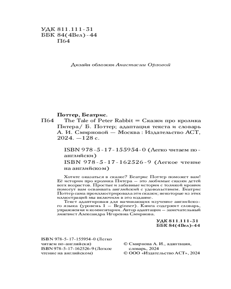 💳 Оплатить за товар можно при получении 🇰🇿 Есть бесплатная доставка по Казахстану от 1 дня 🎁 Копите бонусы с каждой покупки Серия: Легкое чтение на английском Хотите оказаться в сказке? Беатрис Поттер поможет вам! Её истории про кролика Питера — это любимые сказки детей всех возрастов. Простые и забавные истории с толикой иронии помогут вам осваивать английский с удовольствием. Беатрис Поттер сама проиллюстрировала эти сказки; некоторые из этих иллюстраций мы включили в это издание. Текст адаптирован для начинающих изучение английского языка (уровень 1 — Beginner (A1)). Книга содержит словарь, упражнения и комментарии. Автор адаптации — замечательный лингвист Александра Игоревна Смирнова. |