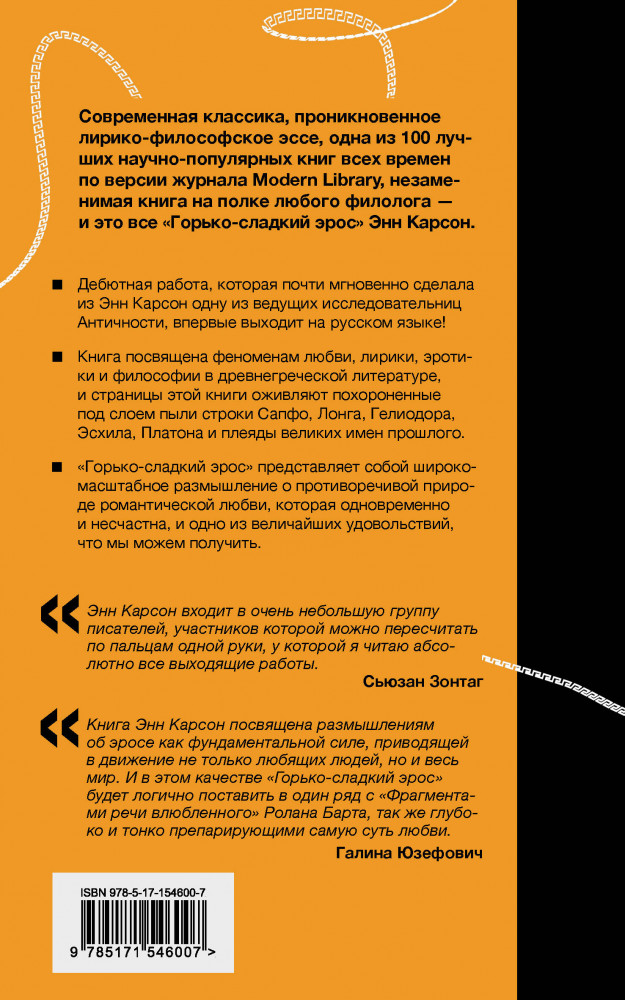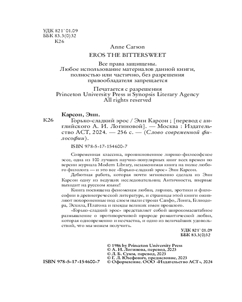 💳 Оплатить за товар можно при получении 🇰🇿 Есть бесплатная доставка по Казахстану от 1 дня 🎁 Копите бонусы с каждой покупки Серия: Слово современной философии Современная классика, проникновенное лирико-философское эссе, одна из 100 лучших научно-популярных книг всех времен по версии журнала Modern Library, незаменимая книга на полке любого филолога — и это все «Горько-сладкий эрос» Энн Карсон. Дебютная работа, которая почти мгновенно сделала из Энн Карсон одну из ведущих исследовательниц Античности, впервые выходит на русском языке! |