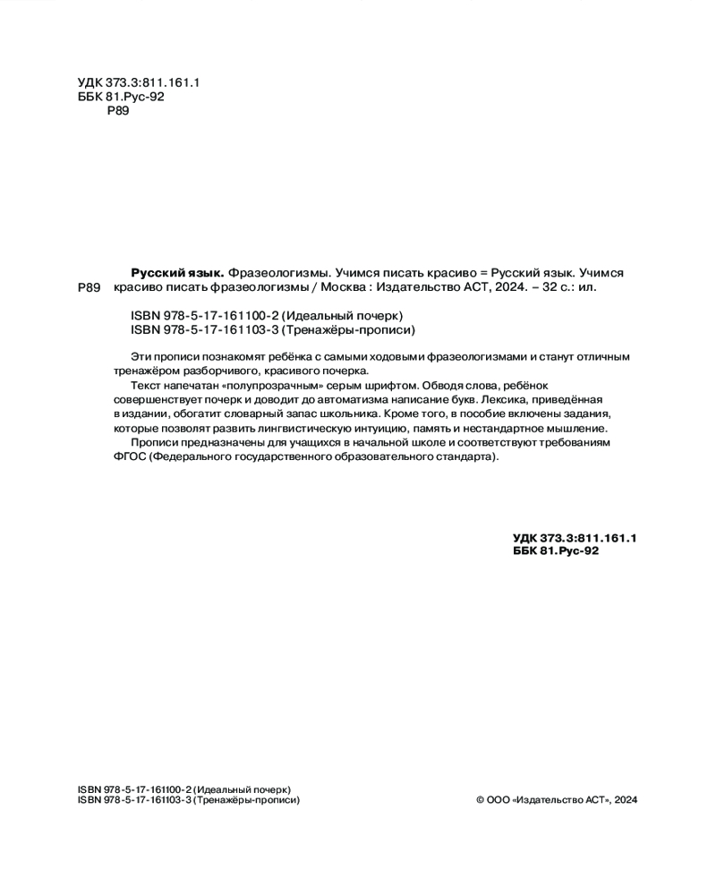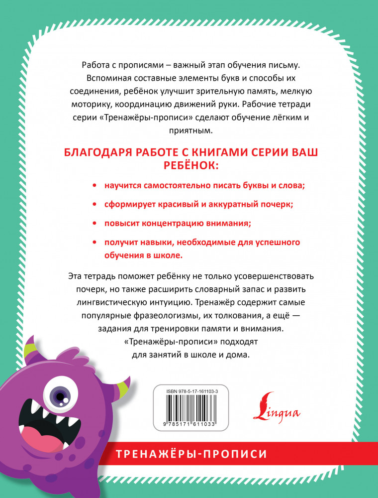 💳 Оплатить за товар можно при получении 🇰🇿 Есть бесплатная доставка по Казахстану от 1 дня 🎁 Копите бонусы с каждой покупки Серия: Тренажёры-прописи Эти прописи познакомят ребёнка с самыми ходовыми фразеологизмами и станут отличным тренажёром разборчивого, красивого почерка. Текст напечатан «полупрозрачным» серым шрифтом. Обводя слова, ребёнок совершенствует почерк и доводит до автоматизма написание букв. Лексика, приведённая в издании, обогатит словарный запас школьника. Кроме того, в пособие включены задания, которые позволят развить лингвистическую интуицию, память и нестандартное мышление. Прописи предназначены для учащихся в начальной школе и соответствуют требованиям ФГОС (Федерального государственного образовательного стандарта). |