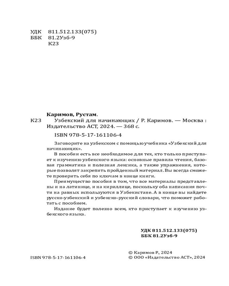 💳 Оплатить за товар можно при получении 🇰🇿 Есть бесплатная доставка по Казахстану от 1 дня 🎁 Копите бонусы с каждой покупки Серия: Иностранный без границ Заговорите на узбекском с помощью учебника «Узбекский для начинающих». В пособии есть все необходимое для тех, кто только приступает к изучению узбекского языка: основные правила чтения, базовая грамматика и полезная лексика, а также упражнения, которые позволят закрепить пройденный материал. Вы всегда сможете проверить себя по ключам в конце книги. |