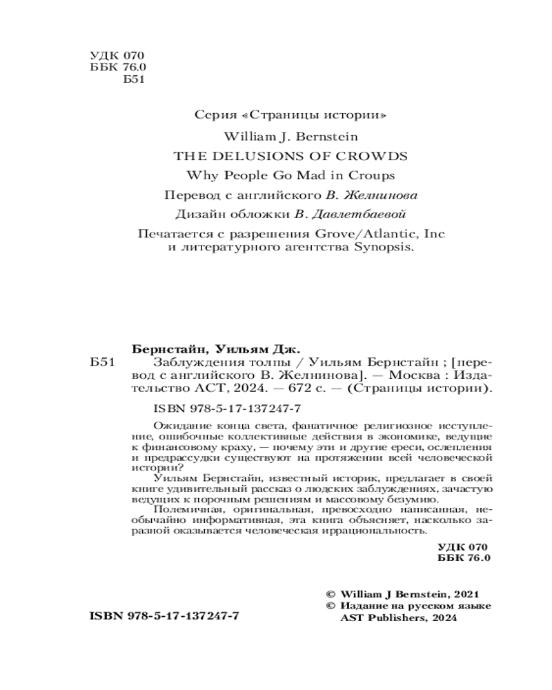 💳 Оплатить за товар можно при получении 🇰🇿 Есть бесплатная доставка по Казахстану от 1 дня 🎁 Копите бонусы с каждой покупки Серия: Страницы истории (Neo) Ожидание конца света, фанатичное религиозное исступление, ошибочные коллективные действия в экономике, ведущие к финансовому краху, — почему эти и другие ереси, ослепления и предрассудки существуют на протяжении всей человеческой истории? Уильям Бернстайн, известный историк, предлагает в своей книге удивительный рассказ о людских заблуждениях, зачастую ведущих к порочным решениям и массовому безумию. Полемичная, оригинальная, превосходно написанная, необычайно информативная, эта книга объясняет, насколько заразной оказывается человеческая иррациональность. |