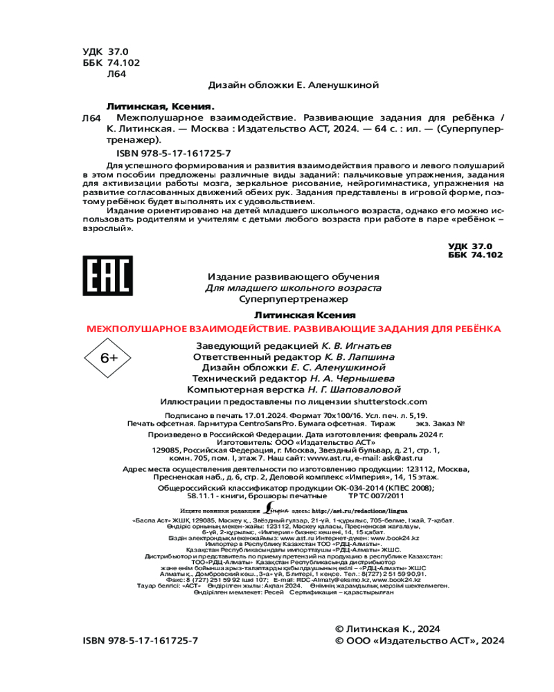💳 Оплатить за товар можно при получении 🇰🇿 Есть бесплатная доставка по Казахстану от 1 дня 🎁 Копите бонусы с каждой покупки Серия: Суперпупертренажер Для успешного формирования и развития взаимодействия правого и левого полушарий в этом пособии предложены различные виды заданий: пальчиковые упражнения, задания для активизации работы мозга, зеркальное рисование, нейрогимнастика, упражнения на развитие согласованных движений обеих рук. Задания представлены в игровой форме, поэтому ребёнок будет выполнять их с удовольствием. Издание ориентировано на детей младшего школьного возраста, однако его можно использовать родителям и учителям с детьми любого возраста при работе в паре «ребёнок — взрослый». |