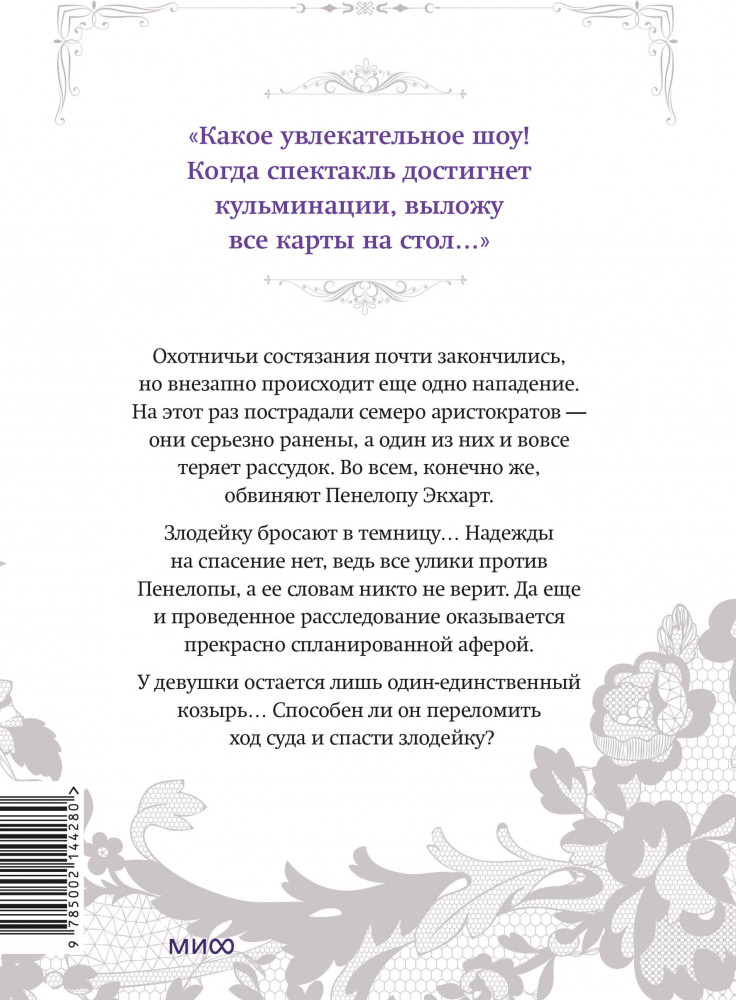 💳 Оплатить за товар можно при получении 🇰🇿 Есть бесплатная доставка по Казахстану от 1 дня 🎁 Копите бонусы с каждой покупки Пятая часть популярной манхвы, где героиня перенеслась в онлайн-игру и стала Пенелопой Экхарт — главной злодейкой, которой все желают смерти. Приближается прием в честь совершеннолетия Пенелопы — день, когда должна вернуться настоящая дочь герцога Ивонна! До конца сложного режима игры остается не больше месяца, а симпатия мужских персонажей так и не достигла 100%. Успеет ли Пенелопа преодолеть все препятствия игровой системы и выжить? |