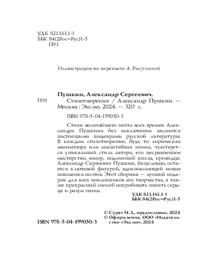 💳 Оплатить за товар можно при получении 🇰🇿 Есть бесплатная доставка по Казахстану от 1 дня 🎁 Копите бонусы с каждой покупки Серия: Собрание больших поэтов Стихи величайшего поэта всех времён Александра Пушкина без исключения являются настоящими шедеврами русской литературы. В каждом стихотворении, будь то лирическая миниатюра или масштабная поэма, чувствуется уникальный стиль автора, его несравненное мастерство, юмор, подлинный взгляд провидца. Александр Сергеевич Пушкин, безусловно, остается ключевой фигурой, вдохновляющий новые поколения поэтов. Этот сборник — лучший подарок для всех поклонников его творчества, а также прекрасный способ попробовать понять сердце и разум гения. |