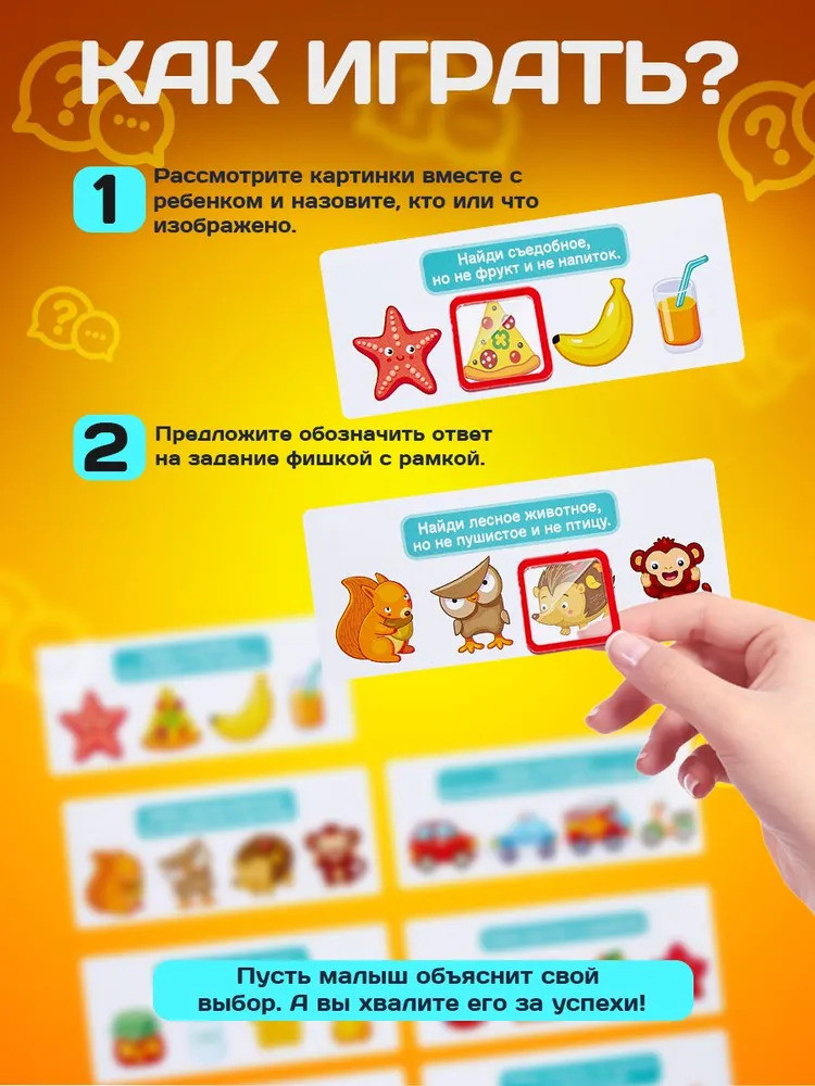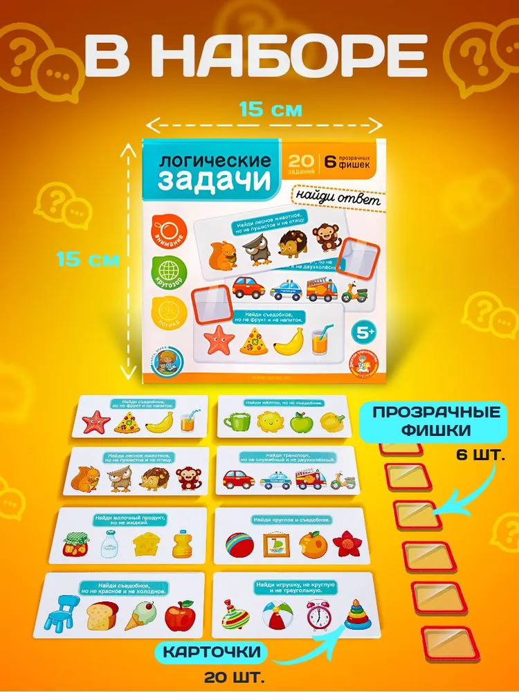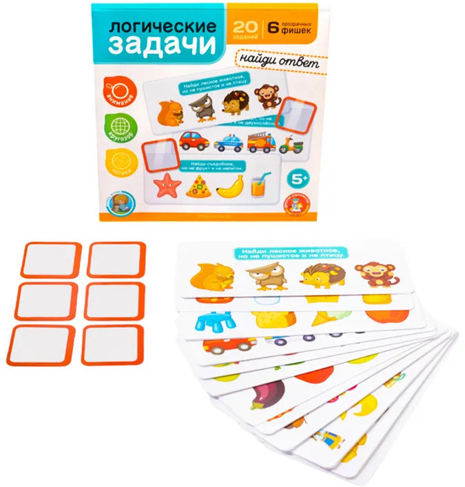 💳 Оплатить за товар можно при получении 🇰🇿 Есть бесплатная доставка по Казахстану от 1 дня 🎁 Копите бонусы с каждой покупки Серия: Учись, играя Развивающая игра для маленьких «Найди ответ — 1» серия «Учись, играя» — обучающий набор с заданиями-карточками и пластиковыми фишками. Развивающая игра для маленьких «Найди ответ» развивает логическое мышление, внимание, речь, кругозор и мелкую моторику. |