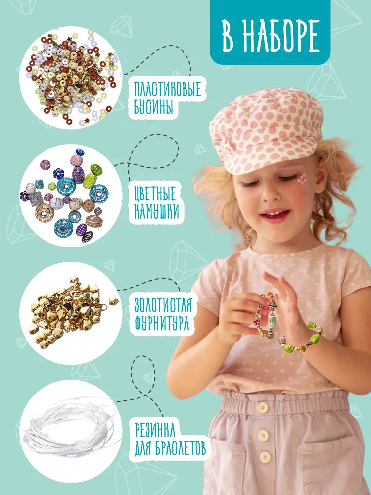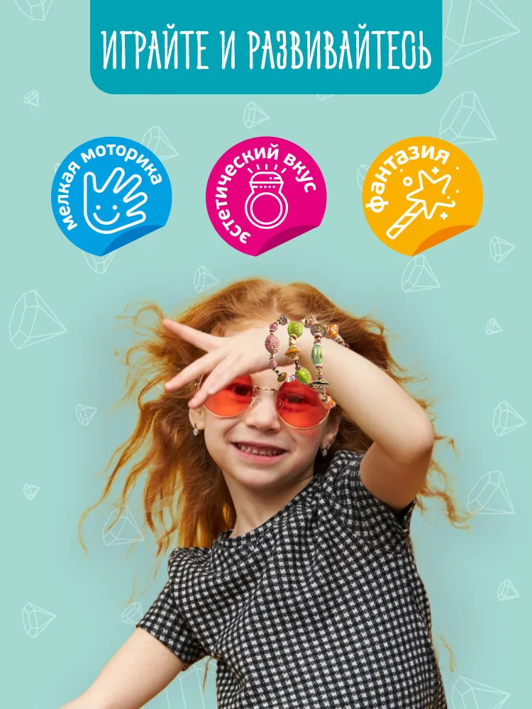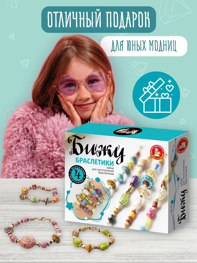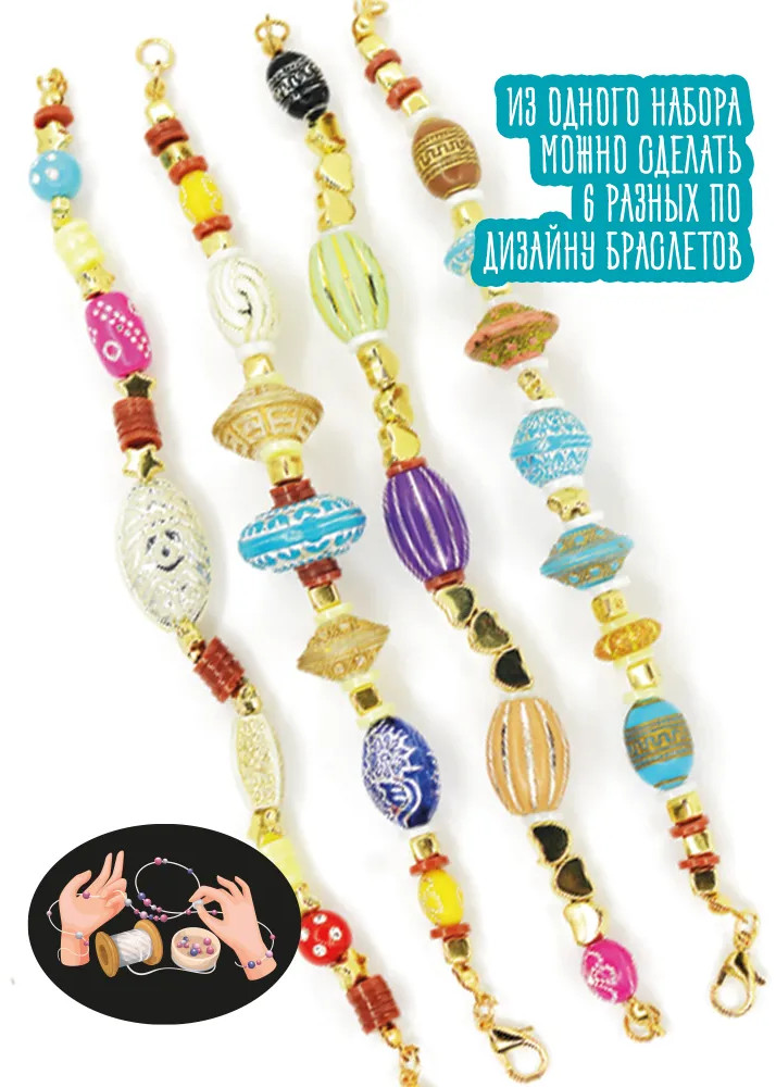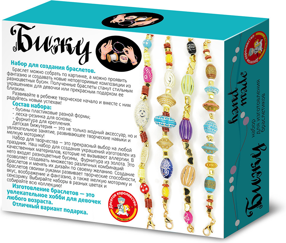 С набором «Браслеты своими руками» девочки придумывают новые украшения, развивают эстетический вкус и чувство прекрасного. При сборке браслетов задействована мелкая моторика и творческая фантазия. Все элементы изготовлены из качественных материалов, которые не вызывают аллергии.