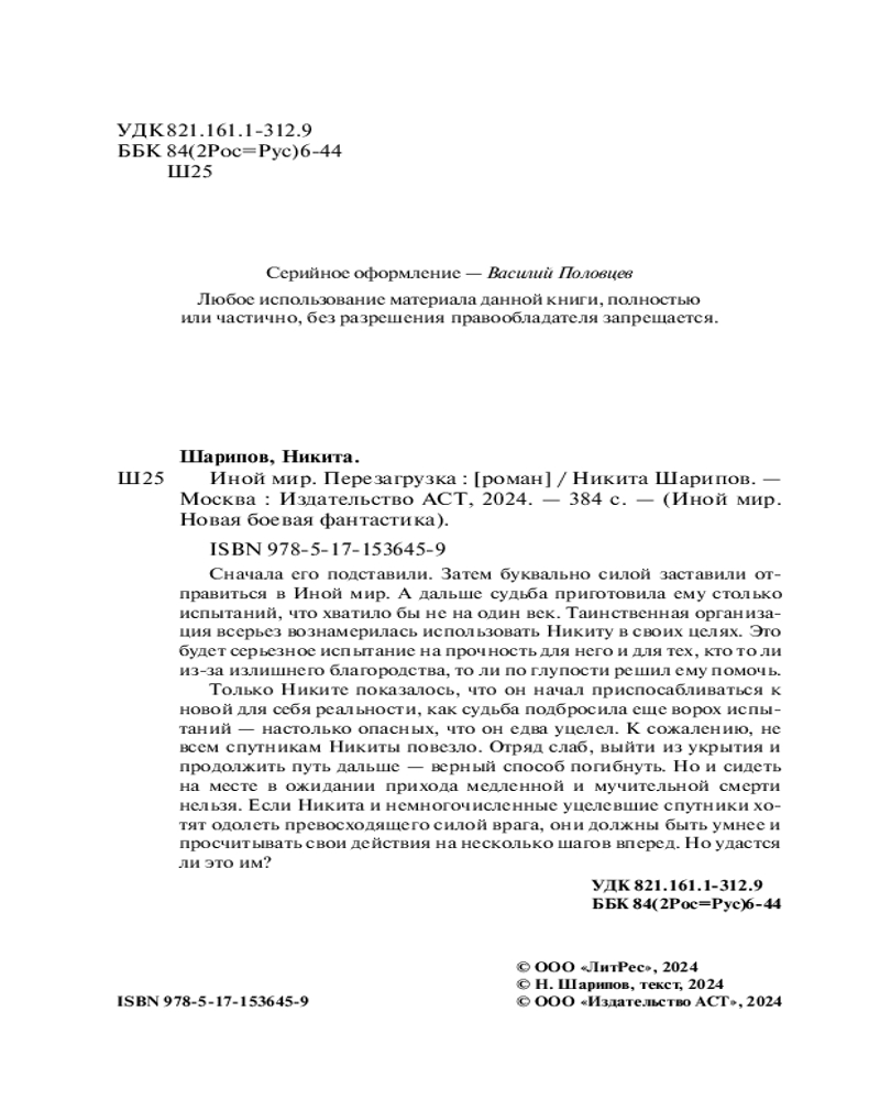 💳 Оплатить за товар можно при получении 🇰🇿 Есть бесплатная доставка по Казахстану от 1 дня 🎁 Копите бонусы с каждой покупки Серия: Иной мир. Новая боевая фантастика Сначала его подставили. Затем буквально силой заставили отправиться в Иной мир. А дальше судьба приготовила ему столько испытаний, что хватило бы не на один век. Таинственная организация всерьез вознамерилась использовать Никиту в своих целях. Это будет серьезное испытание на прочность для него и для тех, кто то ли из-за излишнего благородства, то ли по глупости решил ему помочь. |