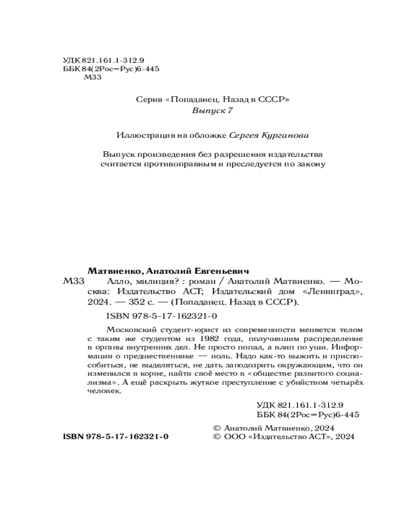 💳 Оплатить за товар можно при получении 🇰🇿 Есть бесплатная доставка по Казахстану от 1 дня 🎁 Копите бонусы с каждой покупки Серия: Попаданец. Назад в СССР Московский студент-юрист из современности меняется телом с таким же студентом из 1982 года, получившим распределение в органы внутренних дел. Не просто попал, а влип по уши. Информации о предшественнике — ноль. Надо как-то выжить и приспособиться, не выделяться, не дать заподозрить окружающим, что он изменился в корне, найти своё место в «обществе развитого социализма». А ещё раскрыть жуткое преступление с убийством четырёх человек. |