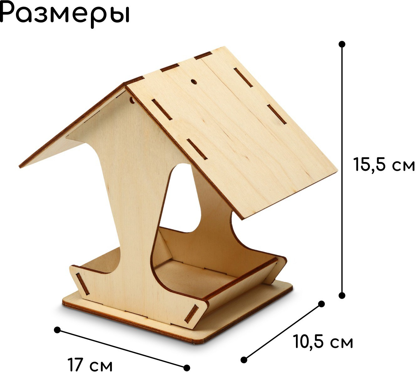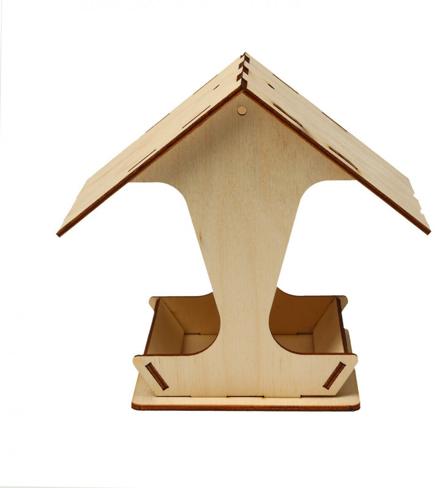 Чтобы собрать кормушку, аккуратно соедините фанерные детали, вставляя их в пазы. Используйте клей для лучшей фиксации. При желании модель можно раскрасить или задекорировать, а чтобы защитить кормушку от воздействия окружающей среды, обработайте поверхность морилкой.