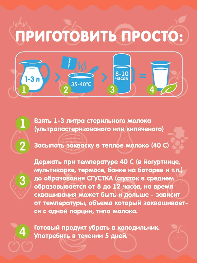 💳 Оплатить за товар можно при получении 🇰🇿 Есть бесплатная доставка по Казахстану от 1 дня 🎁 Копите бонусы с каждой покупки Закваска для приготовления биолакта: богат бифидобактериями, нормализует микрофлору кишечника и имеет приятный вкус. В 1 упаковке 5 порций. Каждая порция сквасит до 3х литров молока, до 15 литров готового продукта с одной упаковки! Можно готовить на коровьем, козьем и некоторых видах растительного молока. |