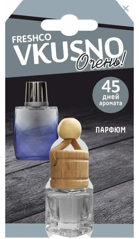Ароматизатор подвесной флакон «Vkusno» «Парфюм» — ароматизатор подвесной в виде бутылочки с деревянной крышкой с натуральными парфюмированными маслами наполнит салон автомобиля непревзойдённым ароматом. Интенсивность и долговечность аромата регулируются самостоятельно (достаточно промочить крышку маслом). Его удобно подвесить в любом удобном для Вас месте в салоне автомобиля: зеркало заднего вида, ручки.