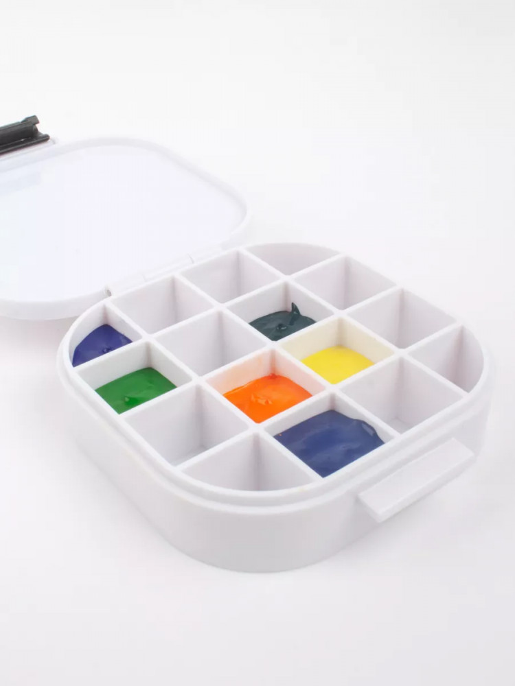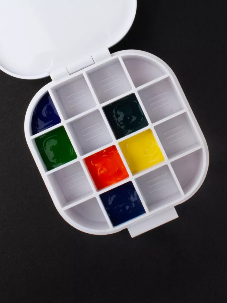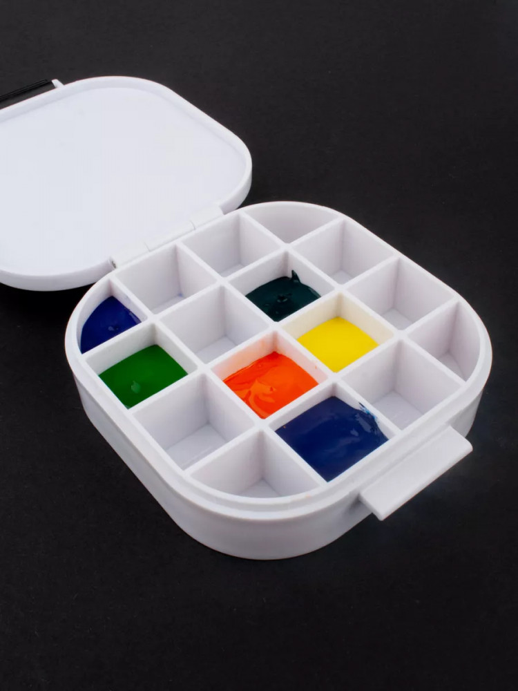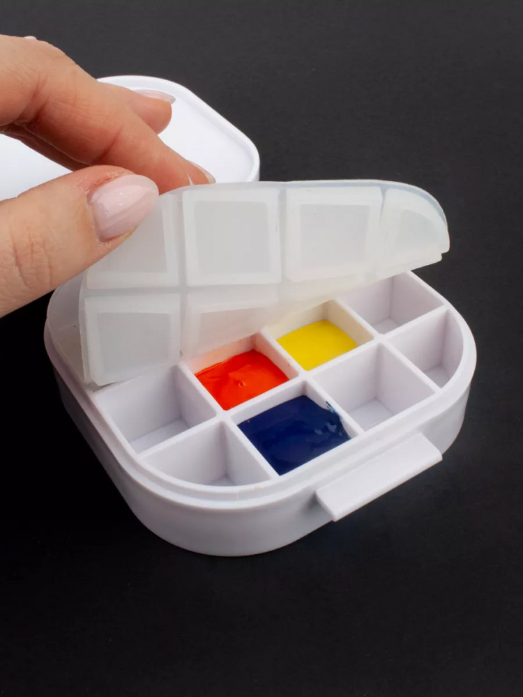 💳 Оплатить за товар можно при получении 🇰🇿 Есть бесплатная доставка по Казахстану от 1 дня 🎁 Копите бонусы с каждой покупки Походная мини палитра Малевичъ для хранения красок. Палитра выполнена из пластика, под крышкой имеется силиконовая вставка, которая обеспечивает герметичность и не даст краскам перетекать из ячейки в ячейку, создавая грязь. Такая палитра будет удобна для акварели, гуаши, акрила, масла. Используйте палитру в поездке, на пленэре, в кафе, в гостях или на пикнике, когда делаете зарисовки. Не рекомендуется заполнять ячейки до краев. Краски будут надежно сохранены долгое время, но не забывайте, что краскам необходимо проветривание при таком хранении и периодически палитру надо открывать для притока свежего воздуха. |