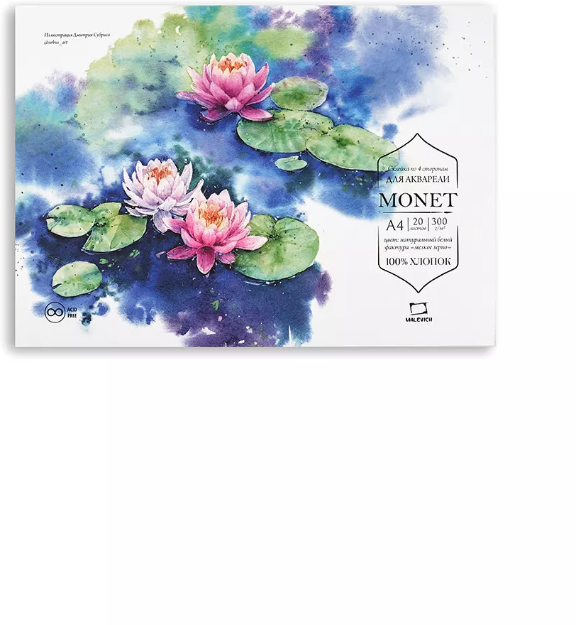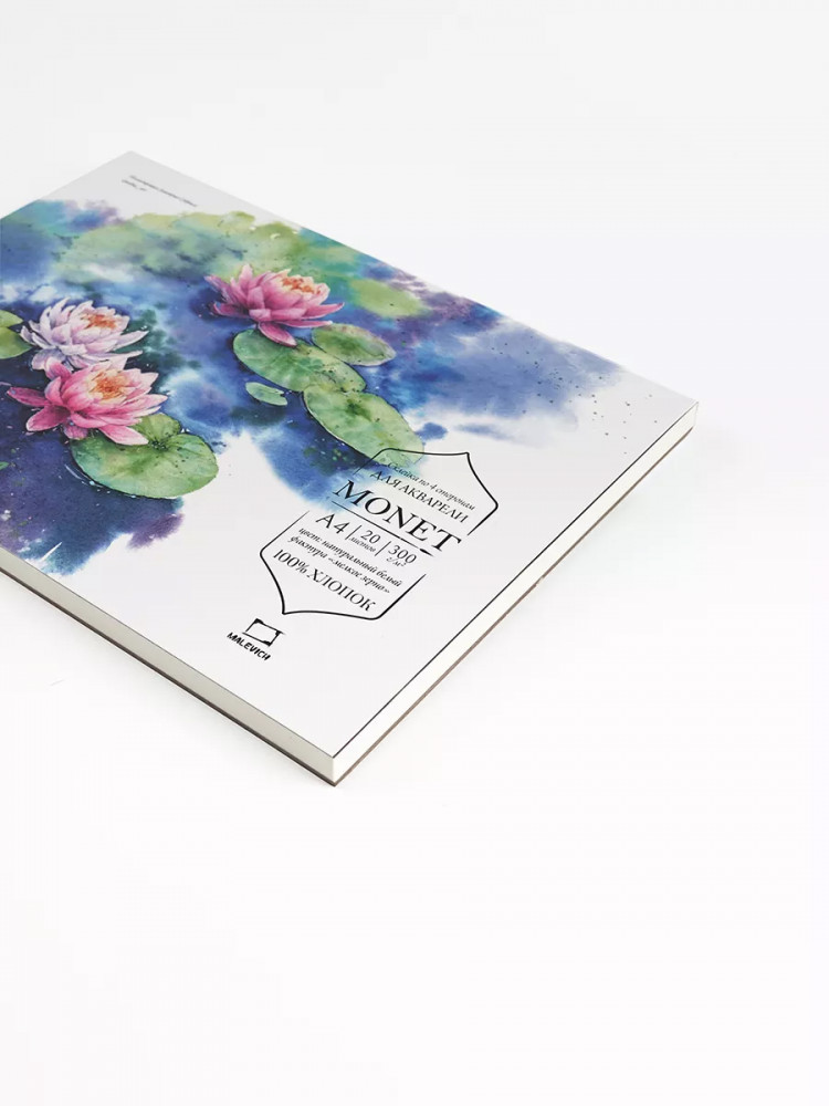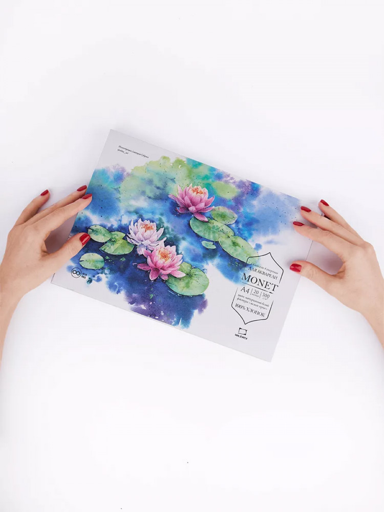 Бумага для акварели из 100% хлопка Моне — это классическая хлопковая бумага с присущими для хлопка свойствами. Она позволяет работать в технике по-мокрому, лист остается влажным и позволяет набирать тон постепенно. Плотность 300 г/кв.м позволяет бумаге держать воду и выравниваться после высыхания.