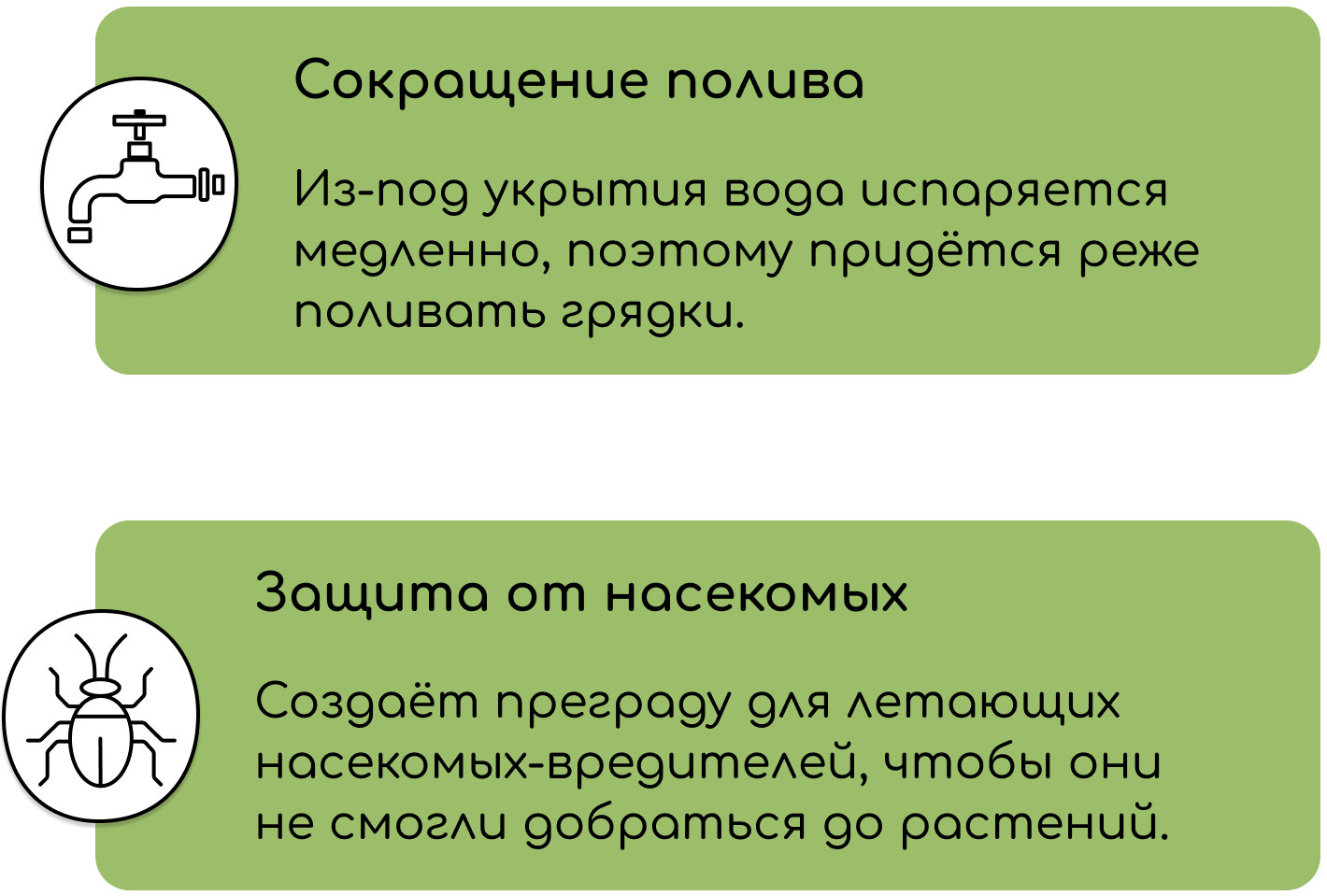 Защищает от заморозков, ожогов, перегревов, осадков и насекомых.
