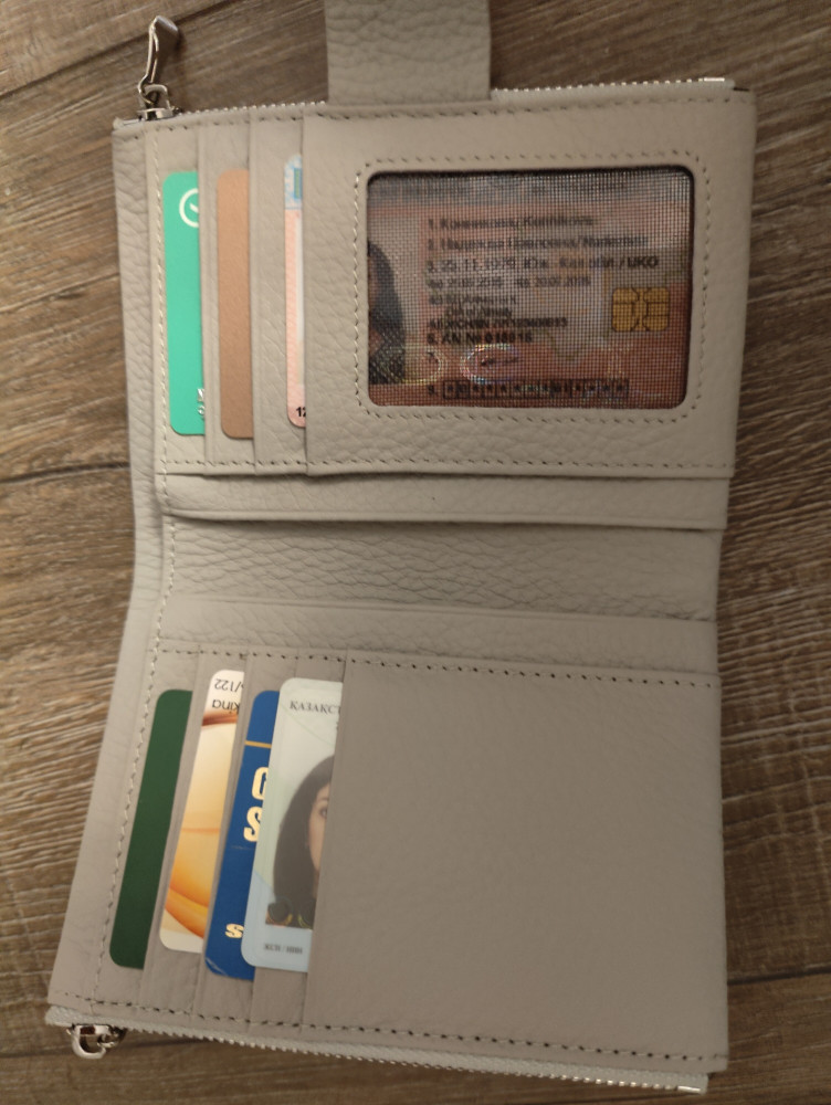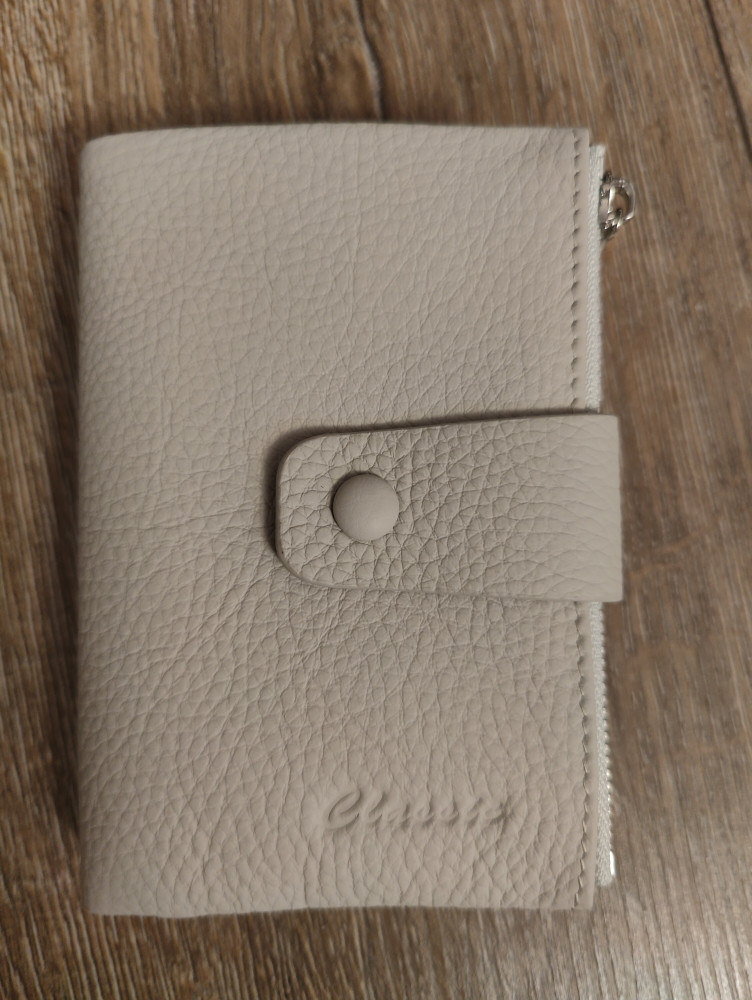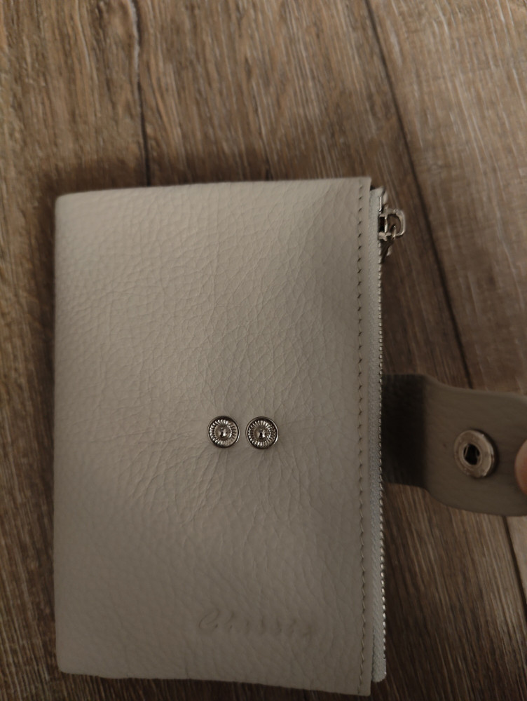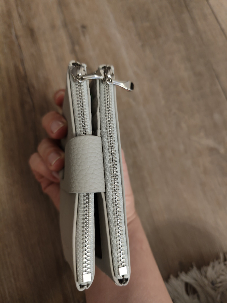 Приятный, благородный светло- серый цвет, на кошельке две кнопки, на случай если он станет толще от содержимого. Без запаха, хорошие металлические замки, когда монетки достанешь, не царапаются. Всё помещается и мало места занимает. Очень удобный, оправдал ожидания, спасибо.