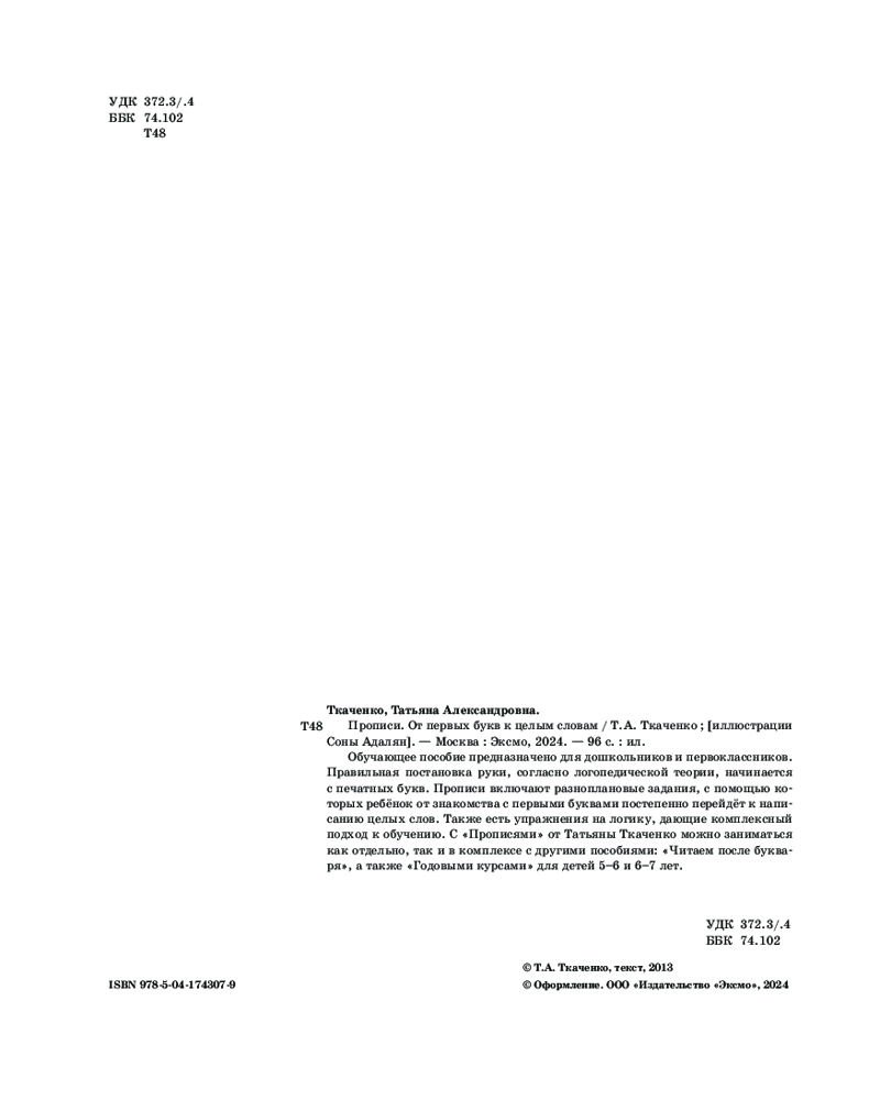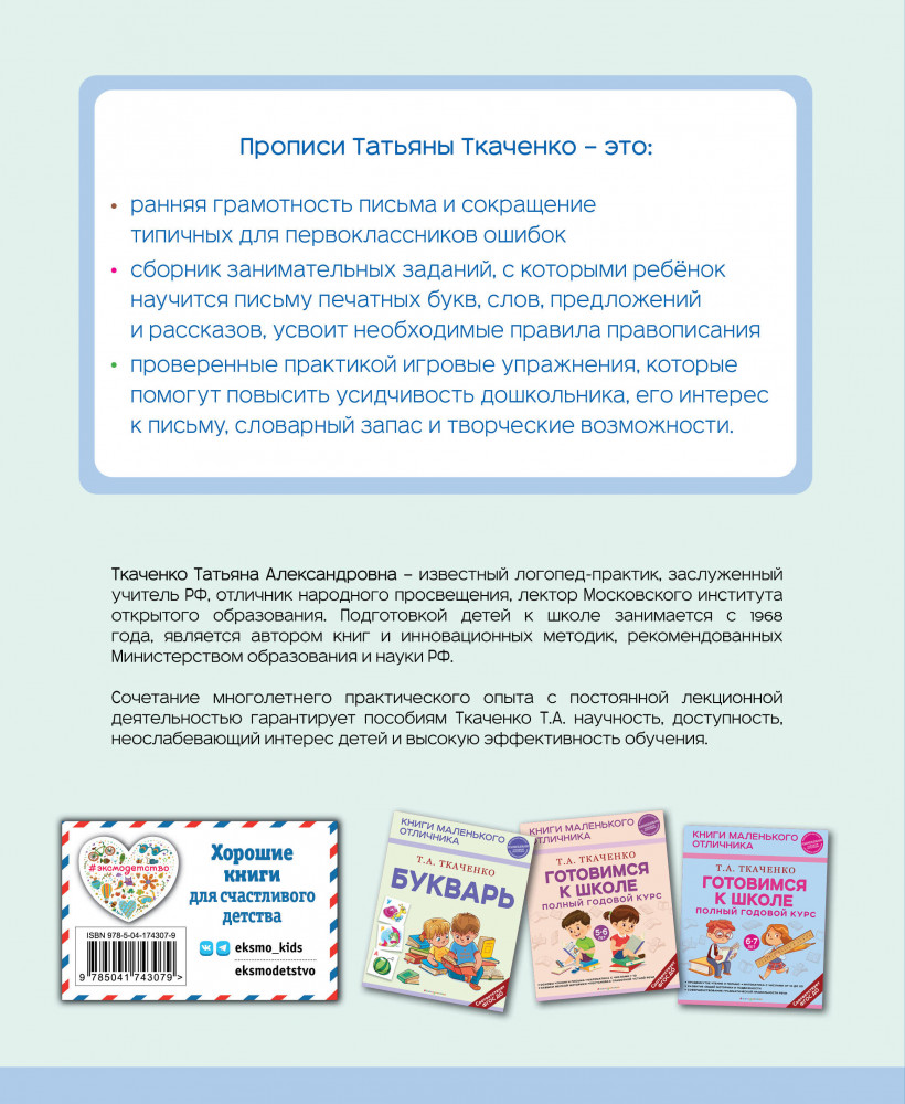 💳 Оплатить за товар можно при получении 🇰🇿 Есть бесплатная доставка по Казахстану от 1 дня 🎁 Копите бонусы с каждой покупки Серия: Татьяна Ткаченко. Книги маленького отличника Освоение письма по системе Ткаченко начинается с печатных букв, что, согласно логопедической теории, является правильной основой для постановки руки. Прописи от Татьяны Ткаченко — вдумчиво разработанное, проверенное пособие по первому письму для будущих школьников. Ребенок легко освоит навыки написания букв и слов с помощью заданий, поданных в игровой форме. Прописи станут подспорьем в обучении грамотности и важной частью системы подготовки дошкольника. |