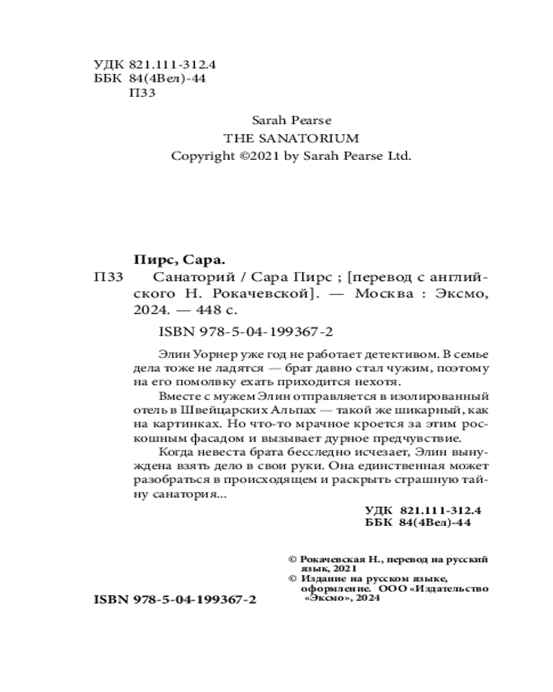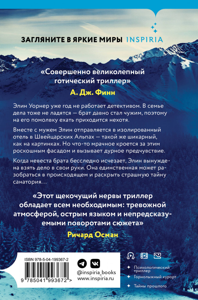 💳 Оплатить за товар можно при получении 🇰🇿 Есть бесплатная доставка по Казахстану от 1 дня 🎁 Копите бонусы с каждой покупки Серия: Tok. И не осталось никого (клатчбук) Элин Уорнер уже год не работает детективом. В семье дела тоже не ладятся — брат давно стал чужим, поэтому на его помолвку ехать приходится нехотя. Вместе с мужем Элин отправляется в изолированный отель в Швейцарских Альпах — такой же шикарный, как на картинках. Но что-то мрачное кроется за этим роскошным фасадом и вызывает дурное предчувствие. Когда невеста брата бесследно исчезает, Элин вынуждена взять дело в свои руки. Она единственная может разобраться в происходящем и раскрыть страшную тайну санатория... |