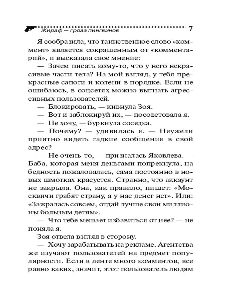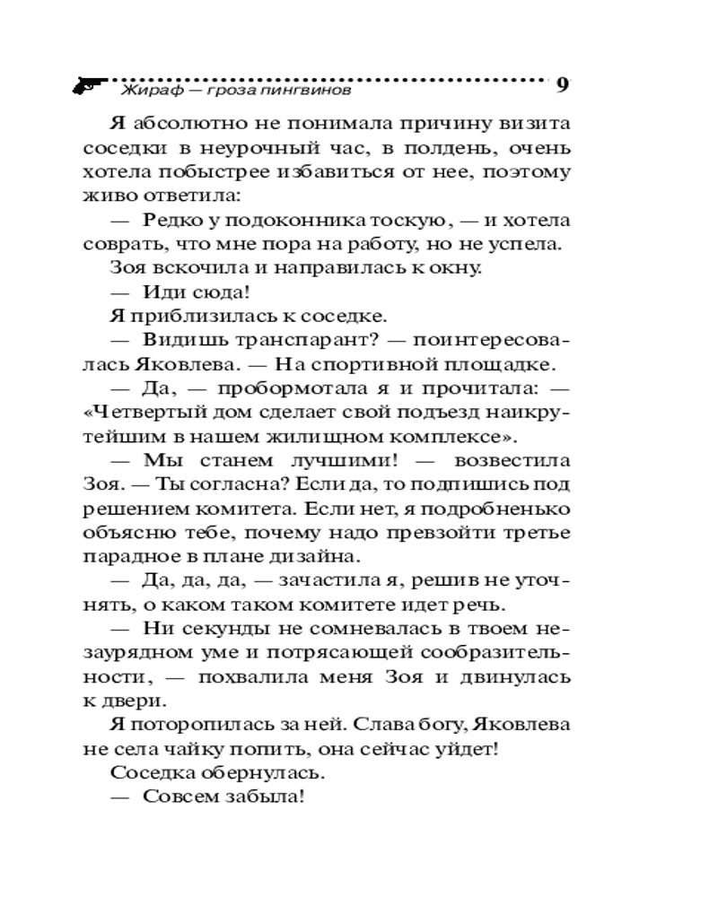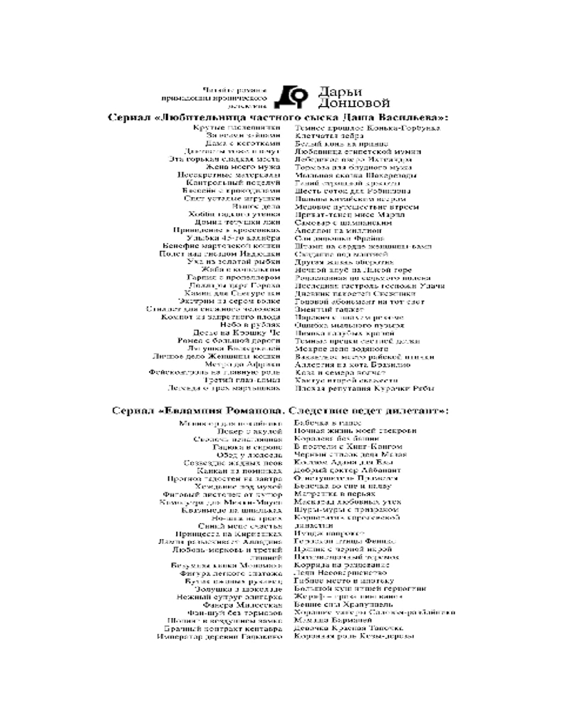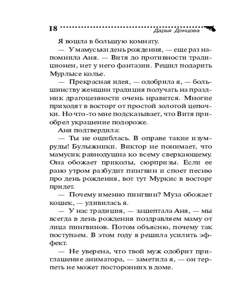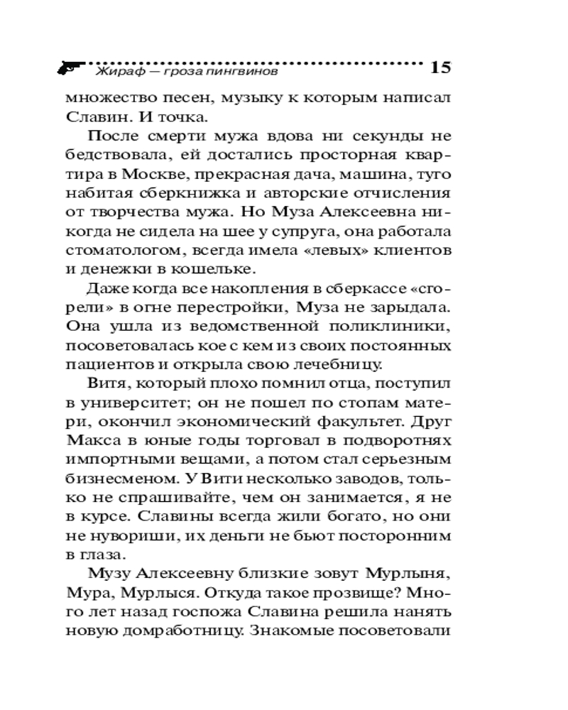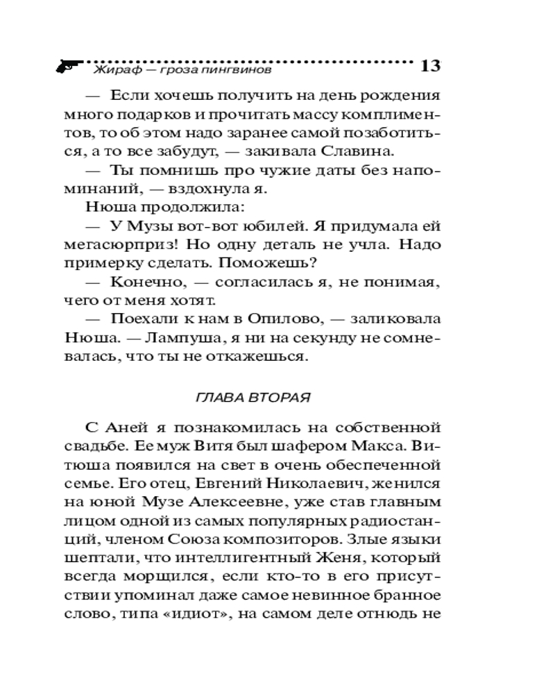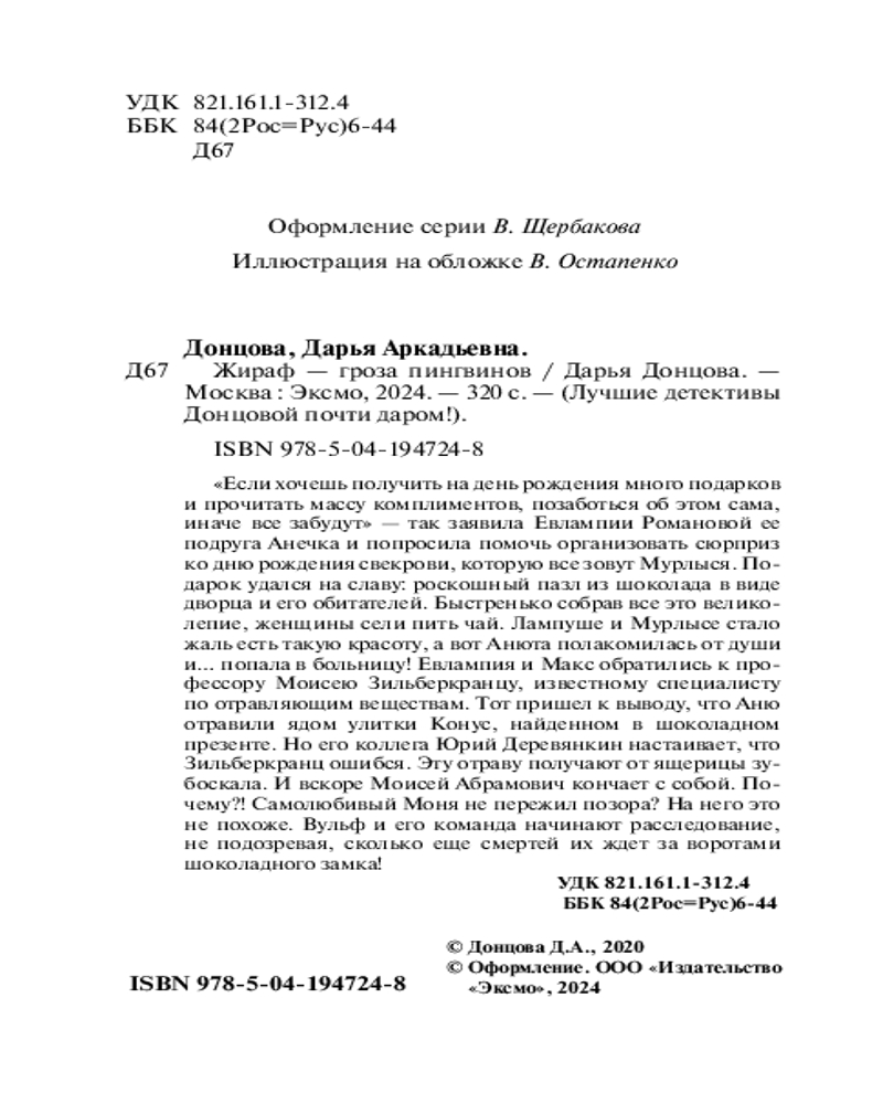 Жираф — гроза пингвиновВ данный момент этот товар отсутствует в продаже. Возможно, у нас найдется аналогичный или похожий товар здесь. Серия: Лучшие детективы Донцовой почти даром! (обложка) «Если хочешь получить на день рождения много подарков и прочитать массу комплиментов, позаботься об этом сама, иначе все забудут». Так заявила Евлампии Романовой ее подруга Анечка и попросила помочь организовать сюрприз ко дню рождения свекрови, которую все зовут Мурлыся. Подарок удался на славу: роскошный пазл из шоколада в виде дворца и его обитателей. Быстренько собрав все это великолепие, женщины сели пить чай. Лампуше и Мурлысе стало жаль есть такую красоту, а вот Анюта полакомилась от души и... попала в больницу! Евлампия и Макс обратились к профессору Моисею Зильберкранцу, известному специалисту по отравляющим веществам. Тот пришел к выводу, что Аню отравили ядом улитки Конус, найденном в шоколадном презенте. Но его коллега Юрий Деревянкин настаивает, что Зильберкранц ошибся. Эту отраву получают от ящерицы зубоскала. И вскоре Моисей Абрамович кончает с собой. Почему?! Самолюбивый Моня не пережил позора? На него это не похоже. Вульф и его команда начинают расследование, не подозревая, сколько еще смертей их ждет за воротами шоколадного замка! |