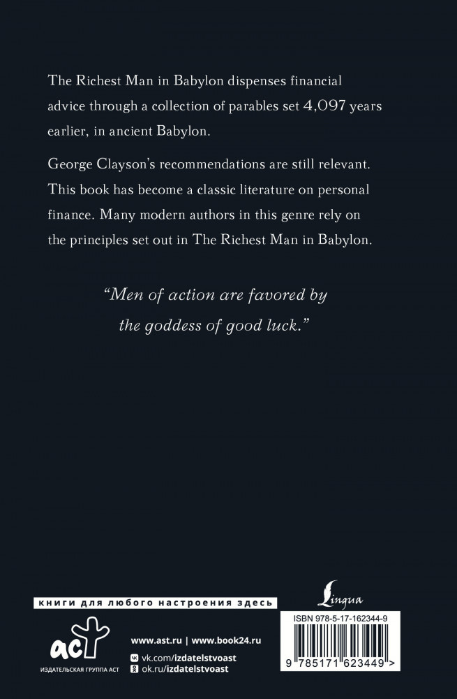 💳 Оплатить за товар можно при получении 🇰🇿 Есть бесплатная доставка по Казахстану от 1 дня 🎁 Копите бонусы с каждой покупки Серия: Exclusive Classics Hardcover Скучно читать книги по финансовой грамотности? Джордж Клейсон еще в 1926 году написал «Самого богатого человека в Вавилоне», где поделился с читателями советами по распределению средств, используя для этого формат вавилонских притч. Клейсон использовал настоящие записи из Древней Месопотамии в качестве источников, поэтому можно сказать, что эта книга откроет вам древнейшие секреты успеха и обогащения. Но даже если вы не заинтересованы в улучшении своего материального блага, то все-равно сможете насладиться занимательными притчами на английском языке. |
