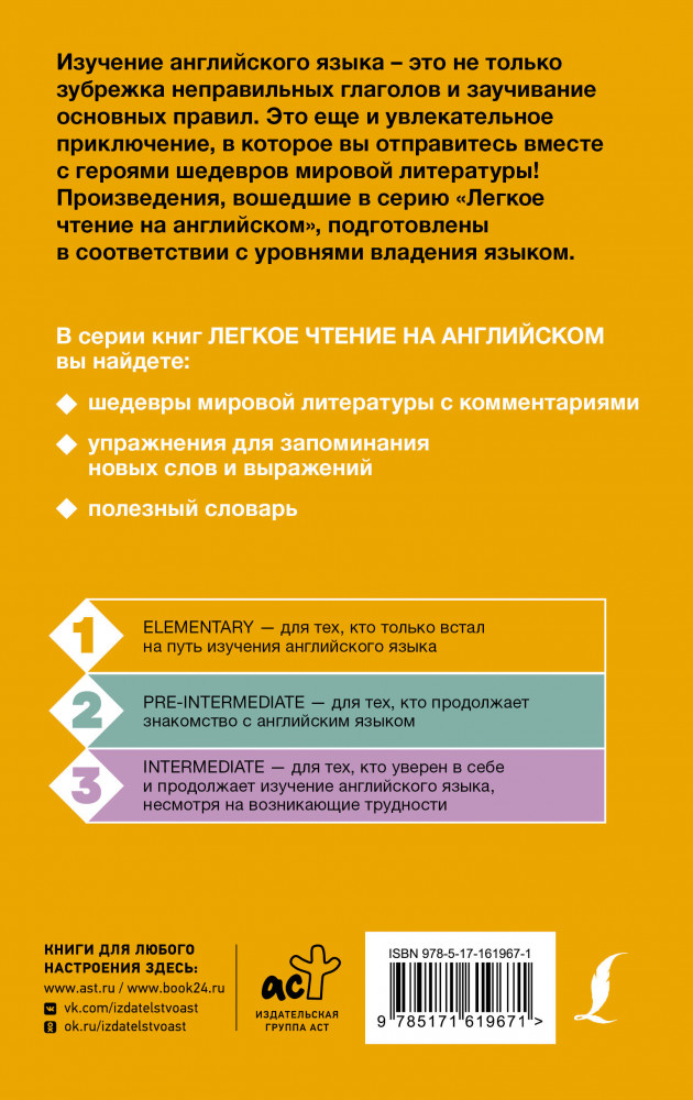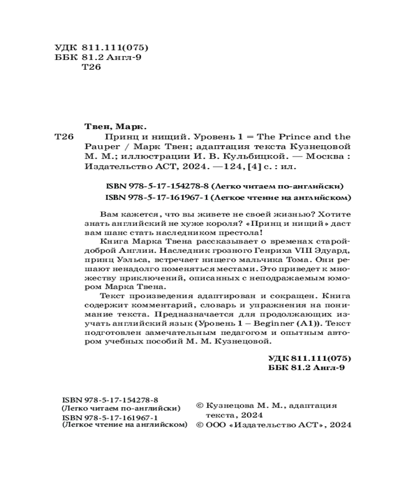 💳 Оплатить за товар можно при получении 🇰🇿 Есть бесплатная доставка по Казахстану от 1 дня 🎁 Копите бонусы с каждой покупки Серия: Легкое чтение на английском Вам кажется, что вы живете не своей жизнью? Хотите знать английский не хуже короля? «Принц и нищий» даст вам шанс попасть из грязи в князи! Книга Марка Твена рассказывает о временах старой доброй Англии. Наследник грозного Генриха VIII Эдуард, принц Уэльса, встречает нищего мальчика Тома. Они решают ненадолго поменяться местами. Это приведет к множеству приключений, описанных с неподражаемым юмором Марка Твена. Текст произведения адаптирован и сокращен. Книга содержит комментарий, словарь и упражнения на понимание текста. Предназначается для продолжающих изучать английский язык (Уровень 1 — Beginner). Текст подготовлен замечательным педагогом и опытным автором учебных пособий М. М. Кузнецовой. |