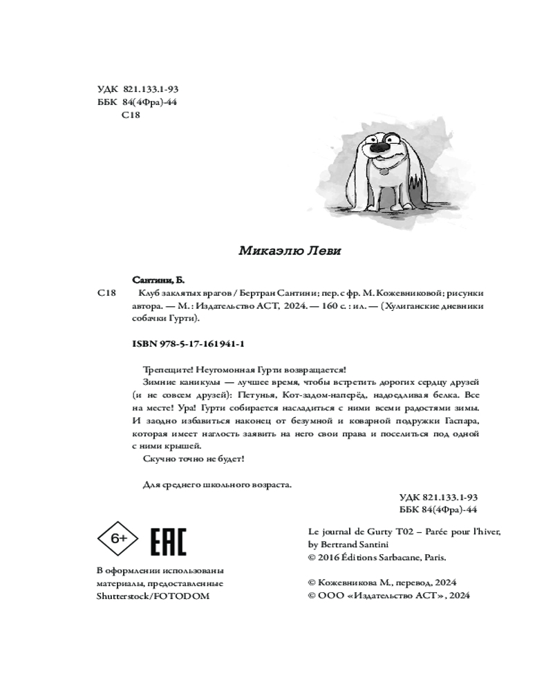 Серия: Хулиганские дневники собачки Гурти Трепещите! Неугомонная Гурти возвращается! Зимние каникулы — лучшее время, чтобы встретить дорогих сердцу друзей (и не совсем друзей): Петунья, Кот—задом—наперёд, надоедливая белка. Все на месте! Ура! Гурти собирается насладиться с ними всеми радостями зимы. И заодно избавиться наконец от безумной и коварной подружки Гаспара, которая имеет наглость заявить на него свои права и поселиться под одной с ними крышей. Скучно точно не будет! |