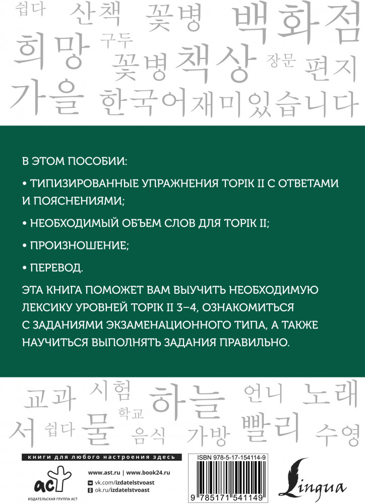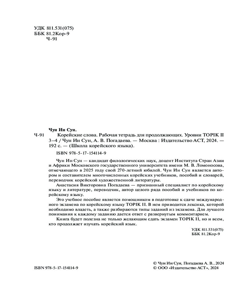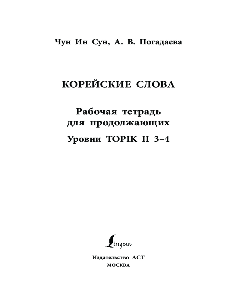Корейские слова. Рабочая тетрадь для продолжающих. Уровни TOPIK II 3–4Анастасия Викторовна Погадаева, Чун Ин Сун В данный момент этот товар отсутствует в продаже. Возможно, у нас найдется аналогичный или похожий товар здесь. Серия: Школа корейского языка Чун Ин Сун — кандидат филологических наук, доцент ИСАА МГУ, автор и составитель многочисленных корейских учебников, пособий и словарей, переводчик корейской художественной литературы. |
