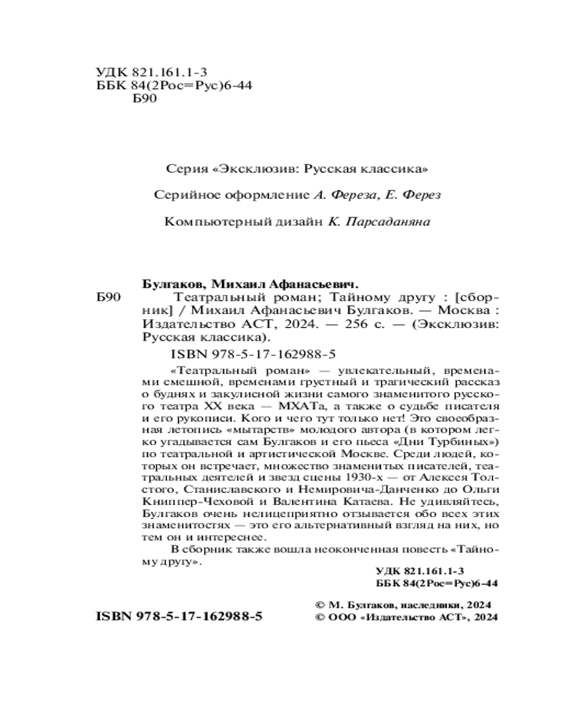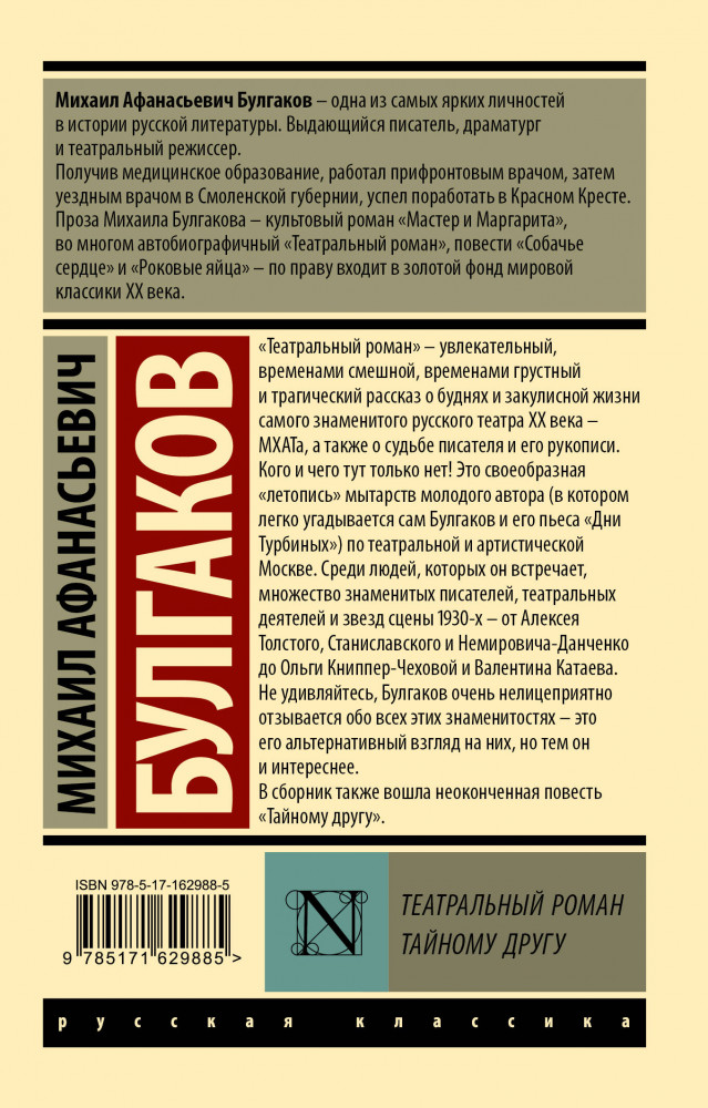 💳 Оплатить за товар можно при получении 🇰🇿 Есть бесплатная доставка по Казахстану от 1 дня 🎁 Копите бонусы с каждой покупки Серия: Эксклюзив: Русская классика «Театральный роман» — увлекательный, временами смешной, временами грустный и трагический рассказ о буднях и закулисной жизни самого знаменитого русского театра ХХ века — МХАТа, а также о судьбе писателя и его рукописи. Кого и чего тут только нет! Это своеобразная летопись «мытарств» молодого автора (в котором легко угадывается сам Булгаков и его пьеса «Дни Турбиных») по театральной и артистической Москве. Среди людей, которых он встречает, множество знаменитых писателей, театральных деятелей и звезд сцены 1930-х — от Алексея Толстого, Станиславского и Немировича-Данченко до Ольги Книппер-Чеховой и Валентина Катаева. Не удивляйтесь, Булгаков очень нелицеприятно отзывается обо всех этих знаменитостях — это его альтернативный взгляд на них, но тем он и интереснее. В сборник также вошла неоконченная повесть «Тайному другу». |