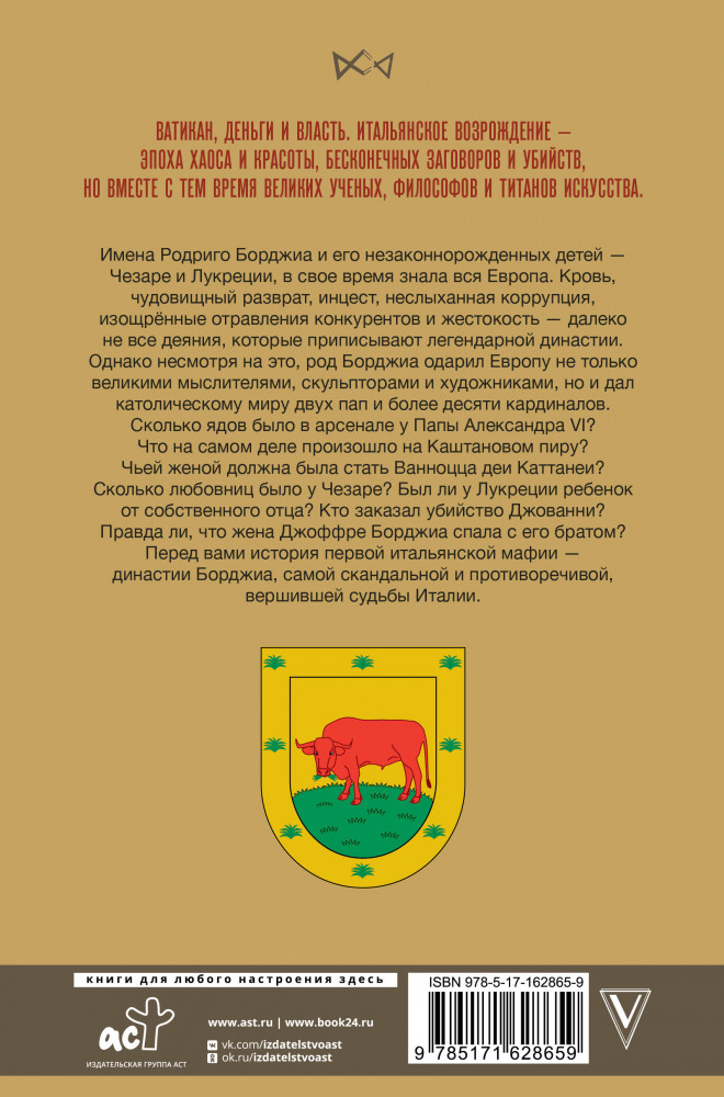 💳 Оплатить за товар можно при получении 🇰🇿 Есть бесплатная доставка по Казахстану от 1 дня 🎁 Копите бонусы с каждой покупки Серия: Династия Ватикан, деньги и власть. Итальянское Возрождение — эпоха хаоса и красоты, бесконечных заговоров и убийств, но вместе с тем время великих ученых, философов и титанов искусства. Имена Родриго Борджиа и его незаконнорожденных детей — Чезаре и Лукреции, в свое время знала вся Европа. Кровь, чудовищный разврат, инцест, неслыханная коррупция, изощрённые отравления конкурентов и жестокость — далеко не все деяния, которые приписывают легендарной династии. Однако несмотря на это, род Борджиа одарил Европу не только великими мыслителями, скульпторами и художниками, но и дал католическому миру двух пап и более десяти кардиналов. |
