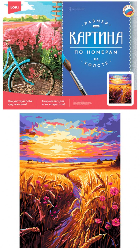 Комплектация: холст на деревянном подрамнике с контуром, акриловые краски, кисть, вспомогательный лист, акриловый лак.