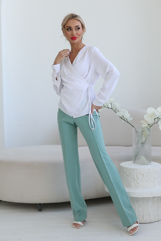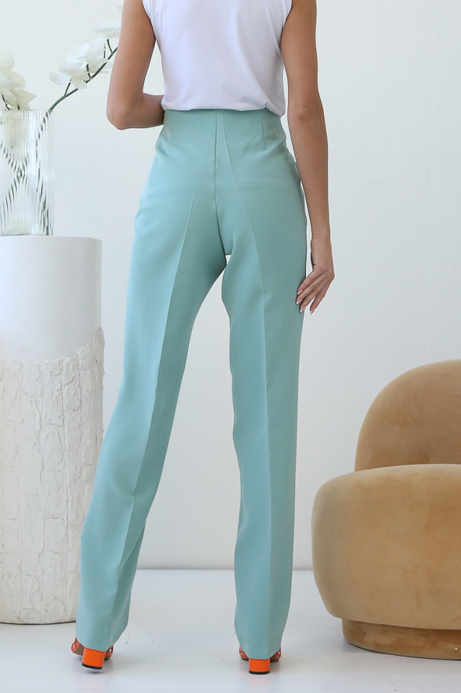 Эффектные брюки из текстильной ткани. Верхний срез изделия обработан внутренней обтачкой. По передним половинкам брюк выполнены декоративные отстрочки. Застежка по боковому шву на потайную молнию. Длина изделия по спинке от пояса до низа изделия — 108 см. Рост фотомодели — 170 см.