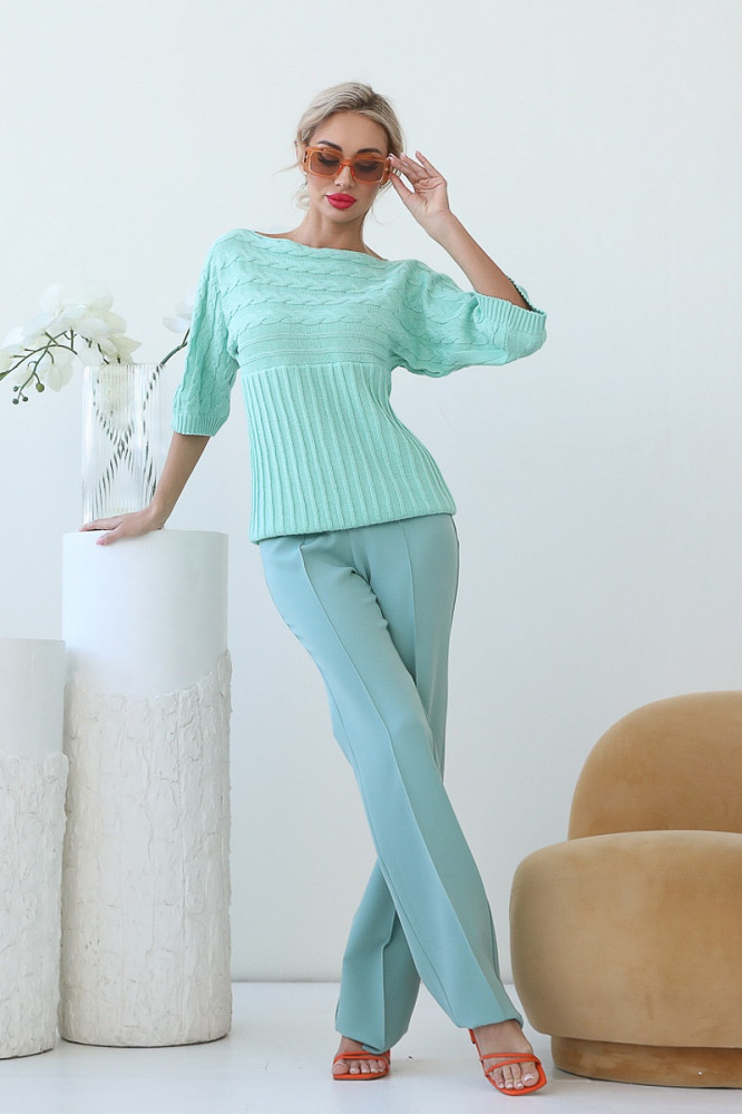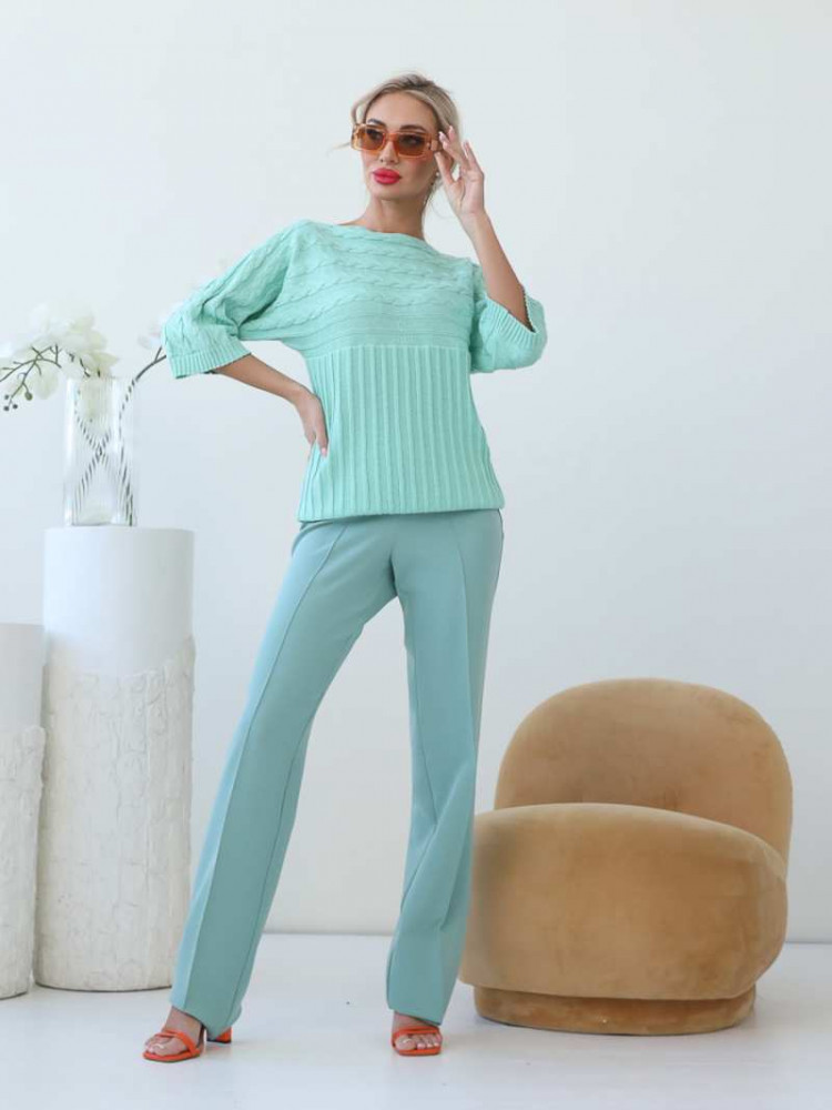 Высокая посадка, плотное облегчение, оформление стрелки спереди швейной строчкой - это очень облегчает глажку после стирки. Полагала, что ткань более плотная тяжёлая, по крайней мере, такой смотрится на фото. На самом деле брюки можно сказать лёгкие. Выписала ещё в двух цветах сером и темно зелёном.