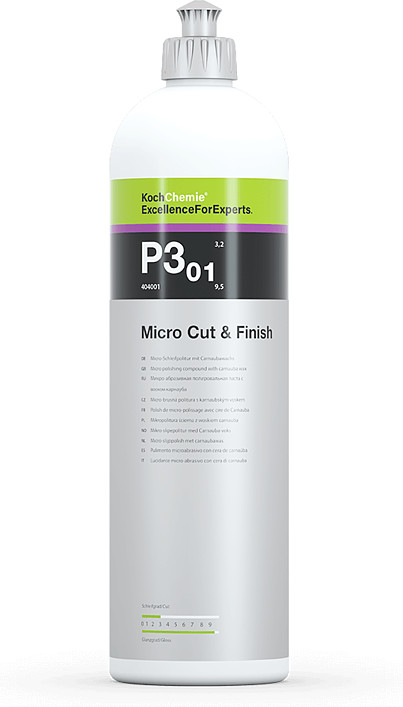 Финишная микроабразивная паста с воском карнауба. Разработана для быстрого и эффективного удаления риски глубиной P3000 и придания поверхности высокого глянца 9,5. Служит вторым и заключительным этапом полировки после абразивной пасты H9.01(402201) и F6.01(405001), а также для финишной обработки после любых абразивных паст. Для любых видов лака. Эффективно работает с применением эксцентриковых машинок и специализированных поролоновых кругов. Консервация воском карнауба позволяет без дополнительных действий выдать готовый результат и защищённую поверхность ЛКП на 5-6 месяцев. Без силикона.