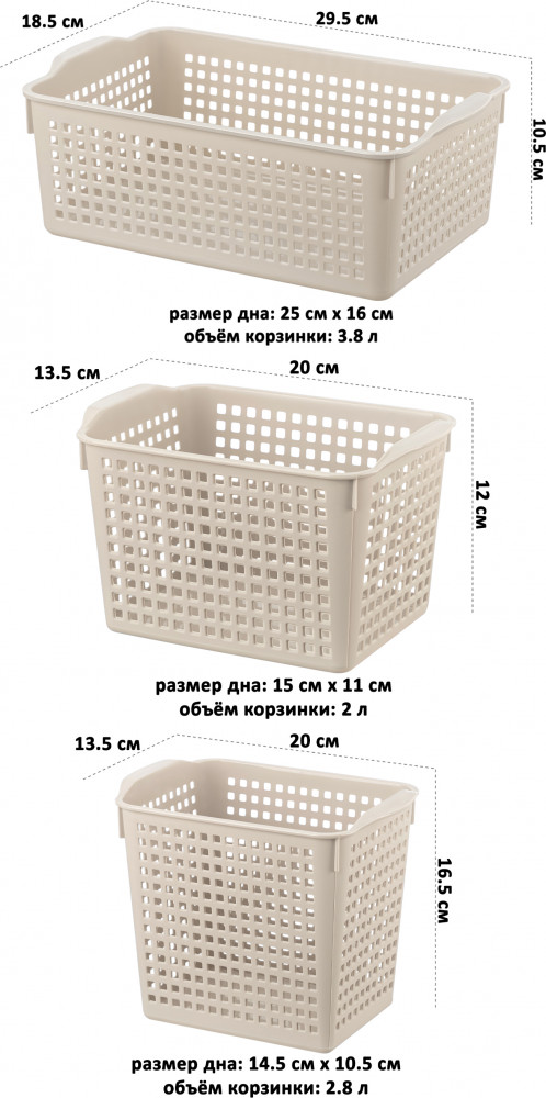 | El Casa Набор корзин для храненияВ данный момент этот товар отсутствует в продаже. Возможно, у нас найдется аналогичный или похожий товар здесь. Серия: Лофт В состав набора входят: две корзины объемом 3,8 литра (размер 29,5 × 18,5 × 10,5 см, дно 25 × 16 см), две корзины объемом 2 литра (размер 20 × 13,5 × 12 см, дно 15 × 11 см), две корзины объемом 2,8 литра (размер 20 × 13,5 × 16,5 см, дно 14,5 × 10,5 см). Органайзеры выполнены из полипропилена. Преимущество данного материала над обычным пластиком в том, что он легкий по весу и наиболее безопасный для здоровья. В универсальном контейнере цвета латте можно хранить как овощи и фрукты, так и кухонные и хозяйственные принадлежности. Используйте емкость для косметики, бытовой химии, моющих средств. Специальное плетение с дырочками позволяет воздуху проникать внутрь и не дает продуктам испортиться от недостатка кислорода. Корзина может быть использована для белья, полотенец и хранения различных мелочей. Такую подставку можно поставить под раковину в ванной, возле стиральной машины или на полку. Ящички можно хранить компактно — один в другом. Используйте в детской комнате как стеллаж или ящик для игрушек. Товары представлены разных объемов, форм и расцветок, что позволит собрать уникальный набор, подходящий под ваши потребности. |