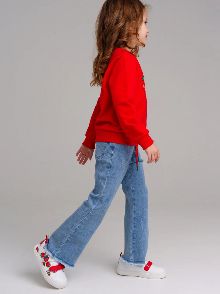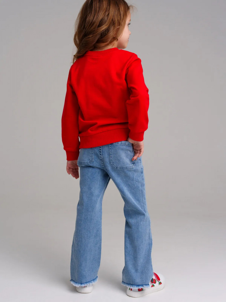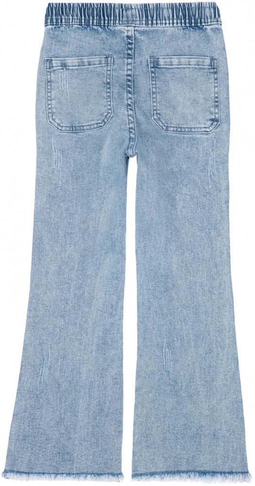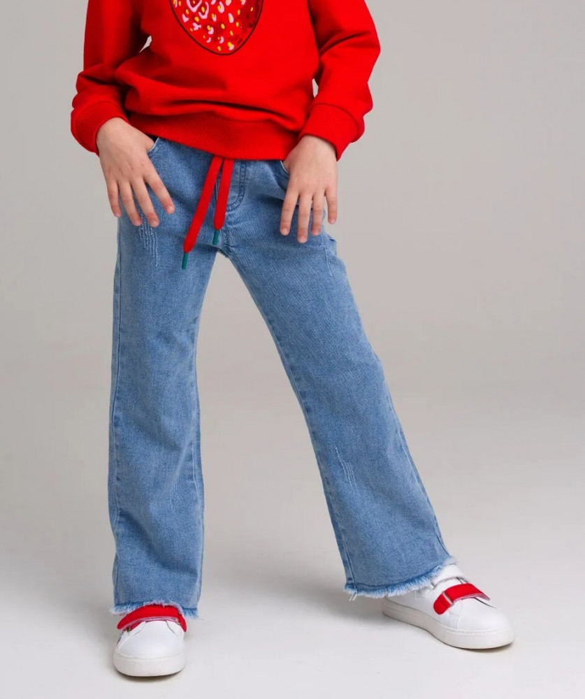 Джинсы для девочки с эффектом потертости. Пояс на резинке со шнурком. Посадка flare fit — облегают талию и бёдра, а от колена расширяются книзу. Высокая посадка.