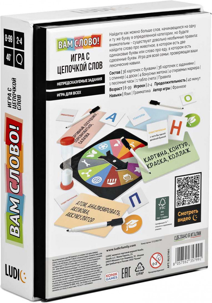 💳 Оплатить за товар можно при получении 🇰🇿 Есть бесплатная доставка по Казахстану 🎁 Копите бонусы с каждой покупки «Вам слово» – это веселая и познавательная настольная игра, которая способствует развитию интеллектуальных навыков и памяти. Задача – придумать как можно больше слов на определенную букву в разных категориях, соблюдая при этом указанные правила. Все просто: возьмите по одной карточке с буквой и заданием, а после вращайте спиннер, чтобы выбрать категорию. Когда категория определена, запускается таймер: вы и остальные участники должны написать как можно больше слов на нужную букву. |