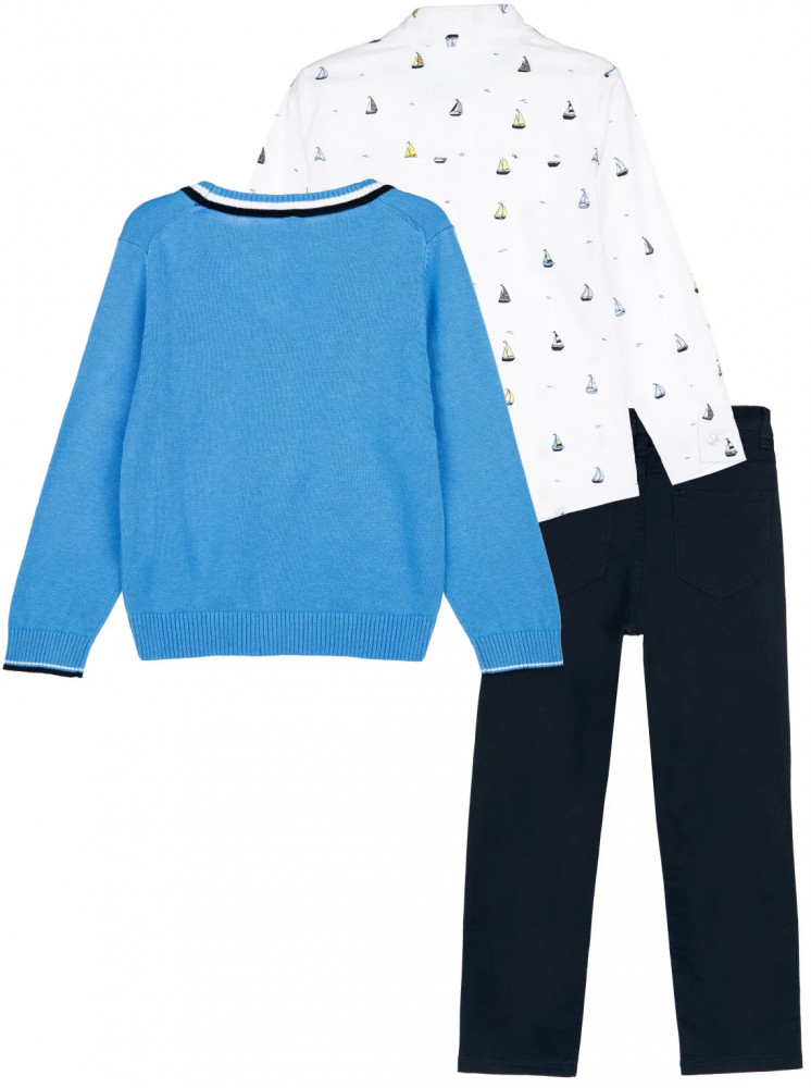 кардиган: 100% хлопок, сорочка: 98% хлопок, 2% эластан, брюки: 97% хлопок, 3% спандекс