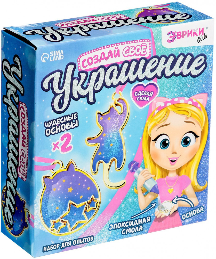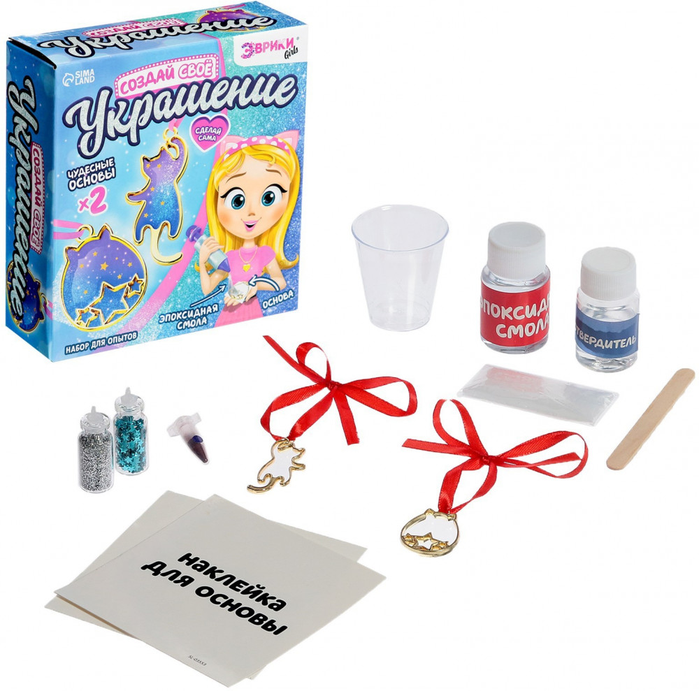 В набор входит: 2 основы, 2 ленточки, отвердитель, эпоксидная смола, краситель, декор, наклейки для основы.