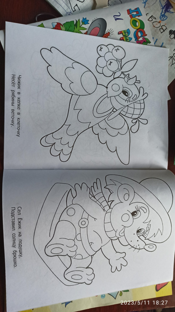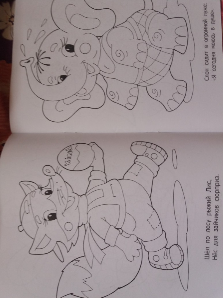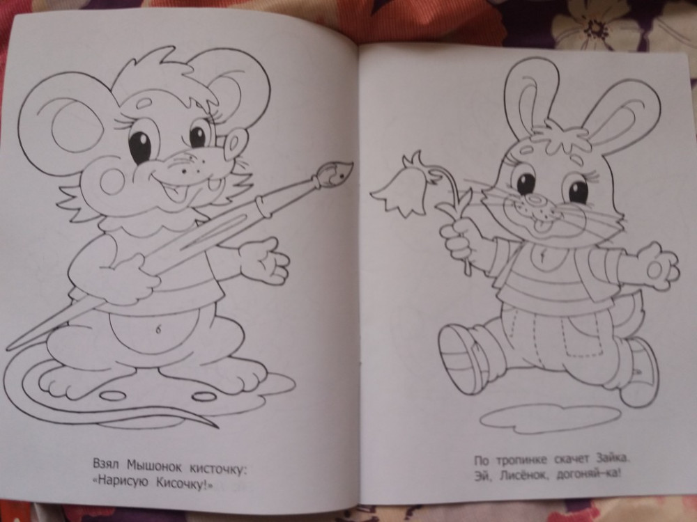 Хорошая книжка, большая. Страницы и переплёт тонкие, но это не так уж и существенно. Рисунки для раскраски интересные, под каждым животным - небольшой текст. Например, под мышкой - текст: "Взял мышонок кисточку, нарисую кисочку". В книжке - животные: Свинка; Мышонок; Зайка; Лис; Слон; Рыбка; Морская звезда; Дракончик; Ёжик; Рыбка; Кит; Бурундук; Бегемот; Медуза; Дельфин; Волк. Хорошая книжка, интересная и полезная!
