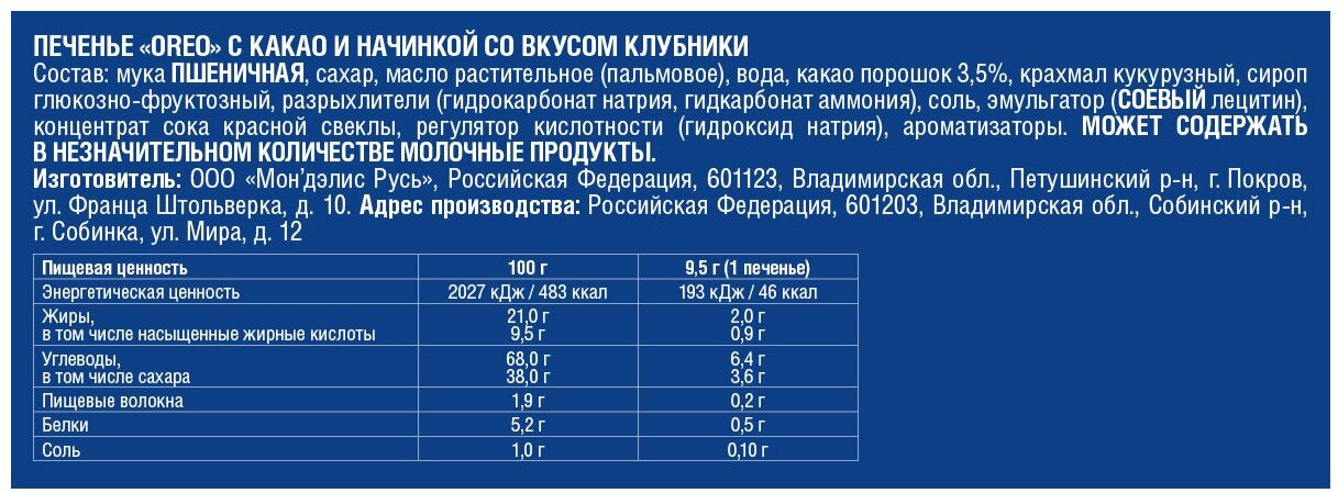 Мука пшеничная, сахар, масло растительное (пальмовое), вода, какао порошок 3.5%, крахмал кукурузный, сироп глюкозно-фруктозный, разрыхлители (гидрокарбонат натрия, гидрокарбонат аммония), соль, эмульгатор (соевый лецитин), концентрат сока красной свеклы, регулятор кислотности (гидроксид натрия), ароматизаторы. Меры предосторожности: Может содержать в незначительном количестве молочный продукты.