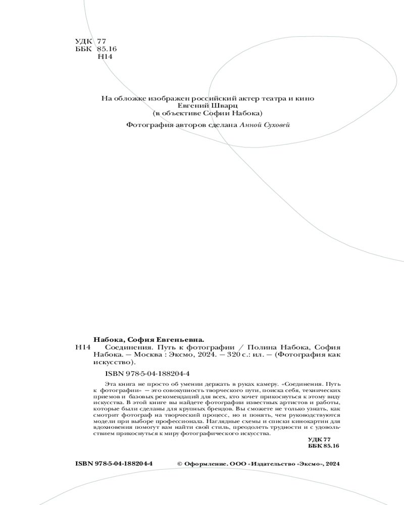 В данный момент этот товар отсутствует в продаже. Возможно, у нас найдется аналогичный или похожий товар здесь. Серия: Фотография как искусство Перед вами книга, которая раскроет тайны любого творческого процесса и превратит ваше видение в настоящее искусство! Практикующие и звездные фотографы Полина и София Набока знают, что фотография — это не просто нажатие кнопки на камере. Это соединение с каждым элементом процесса: камерой, светом, цветом, моделями, командой и даже кризисами.